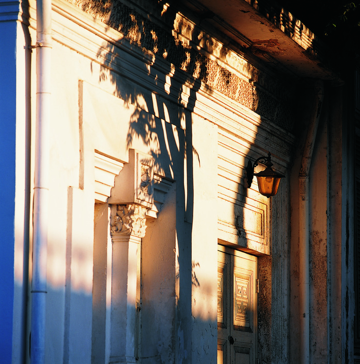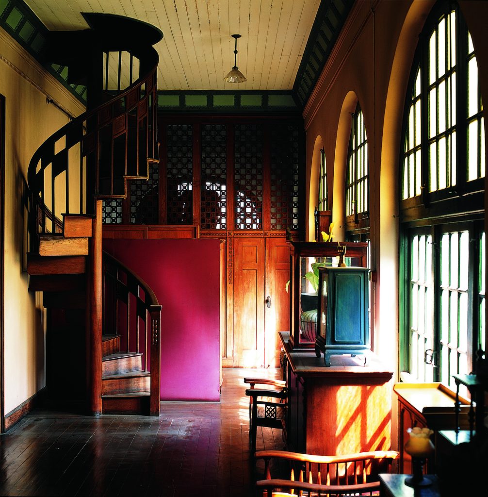 openings, and is decorated with wooden fretwork and stucco. The overall appearance is stately,