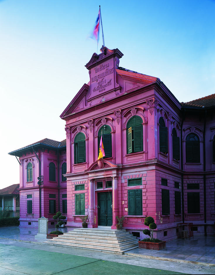 Mathayom Wat Benchamabophit School is located in the Sangkhawas (monk’s private zone) at Wat Benchamabophit Dusitwanaram. The historic building was built in 1902 by funding from Prince Isariyaphon, Prince Anusonsiriprasat, and Cha Chom Manda Keson, a consort of King Rama V. the building has been conserved and, at present, used as the school office and auditorium The building is Renaissance Revival style with a symmetrical plan, hipped roof and 3 porches. The middle porch is gabled and accentuated by a fractable on which inscribed a record on the construction. The ground floor walls are rusticated, rectangular windows whereas the first floor windows are round arched. Decorative elements are sting, systematic, and applied with repeated rhythm which results in a steady and firm look, that may be considered as one of Western influenced architectural characteristics of King Rama V period. It is also noticeable that the building is painted in mauve colour, quoted as the favorite of King Rama