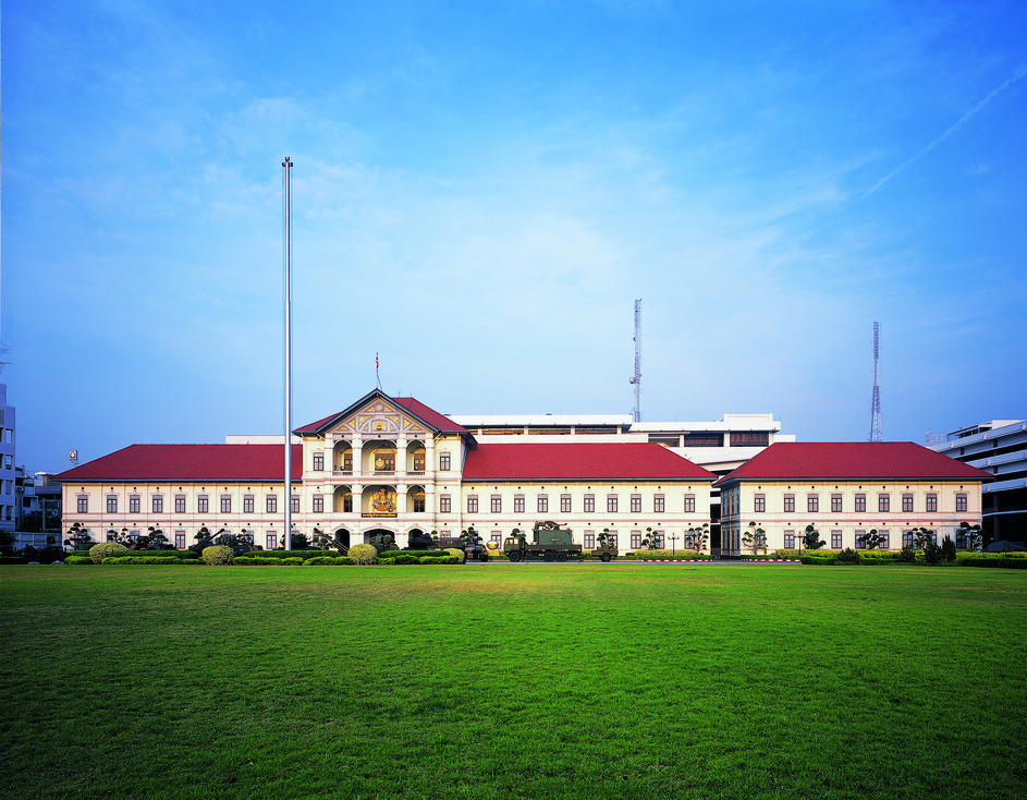 The Royal Thai Army Headquarters was originally built in 1909 AD as a Military School. King Rama V presided over the Opening Ceremony on 25th December, 1987. The Building is neo-Palladian style, two-storey with hipped roof, accentuated by a 3 storey porch at the middle front facade. The porch is gable roof, decorated with the emblem of King Rama V in the pediment, and each storey comprises 3 round arches alternated with superimposed pilaster. The walls are set behind the arches. After the Military School moved to Khao Cha-ngok the building has been used as the Royal Thai Army Headquarters until the present day