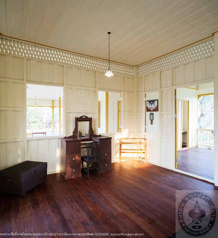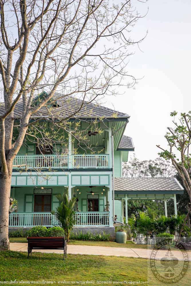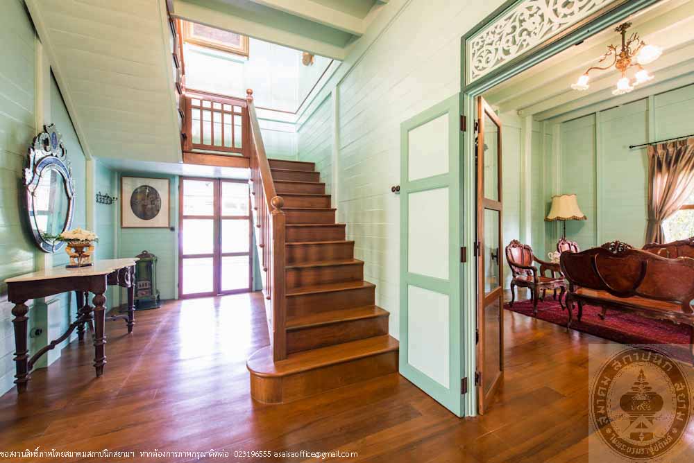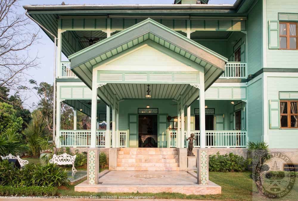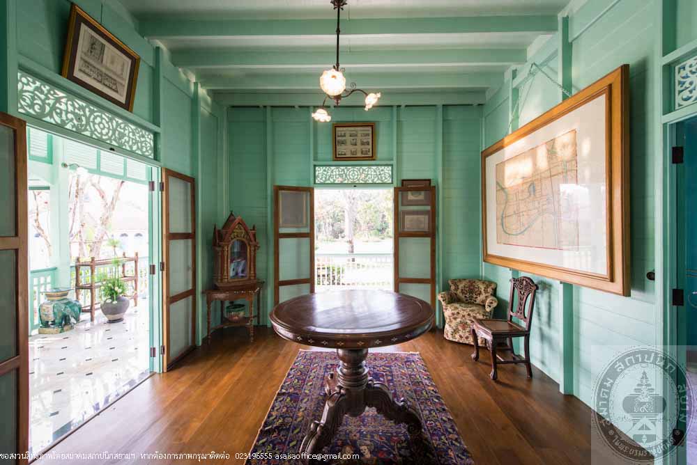Ruan Prasenchit, formerly located in an estate area of Maha Sawek Tree Praya Raja-aksorn (Chai Asawarak) on Si Praya Road in Bangkok was a residence of a noble family back in the days. The mansion was later in the possession of the Khoman family. In 2012, the new owner planned to preserve the mansion and began by compiling historical data, archaeological and architectural information as well as the appraisal of authenticity and integrity of the mansion. Prior to disassembly for moving, records were kept, pictures were taken and each and every parts of the mansion were meticulously marked to be able to perfectly rebuild it to its original design. In an effort to preserve the mansion, materials similar to the original were used including the old teak woods, vintage furniture, electrical switches and plugs, lamps, pictures and antique objects. The mansion was also painted with the paints that replicate the original paint color. Two of the rooms in the back of the mansion were converted into bathrooms while the first floor balcony was replaced with marble instead of wood for ease of use and maintenance. The disassembly of the mansion started in November 2012 and the renovation was completed in October 2014