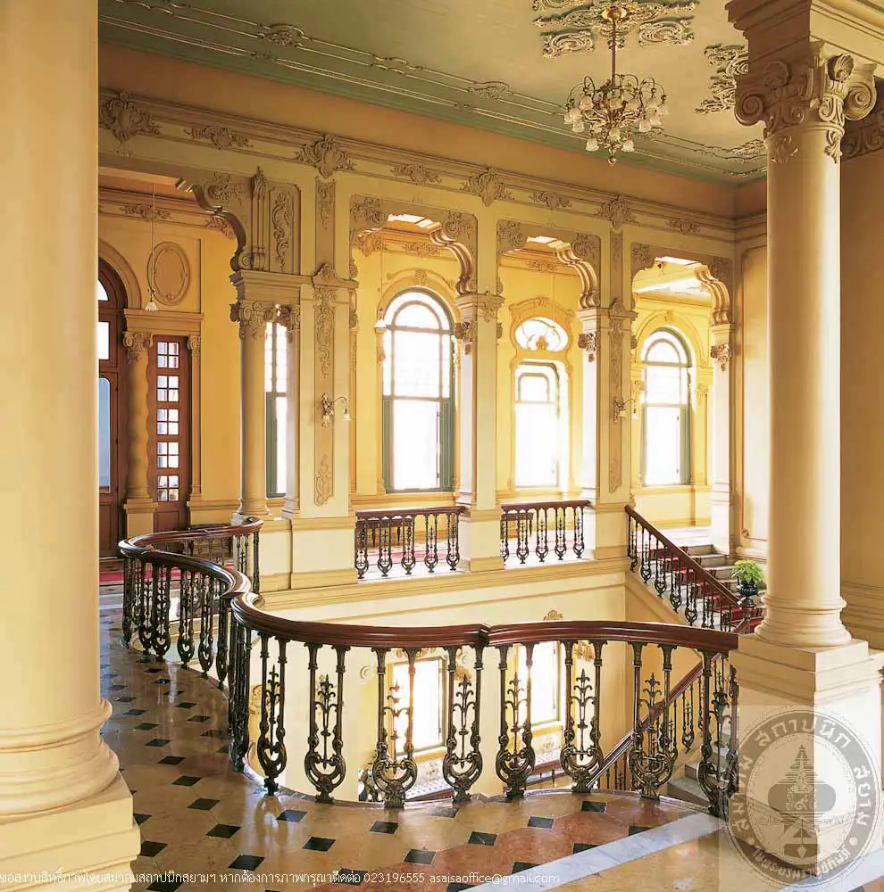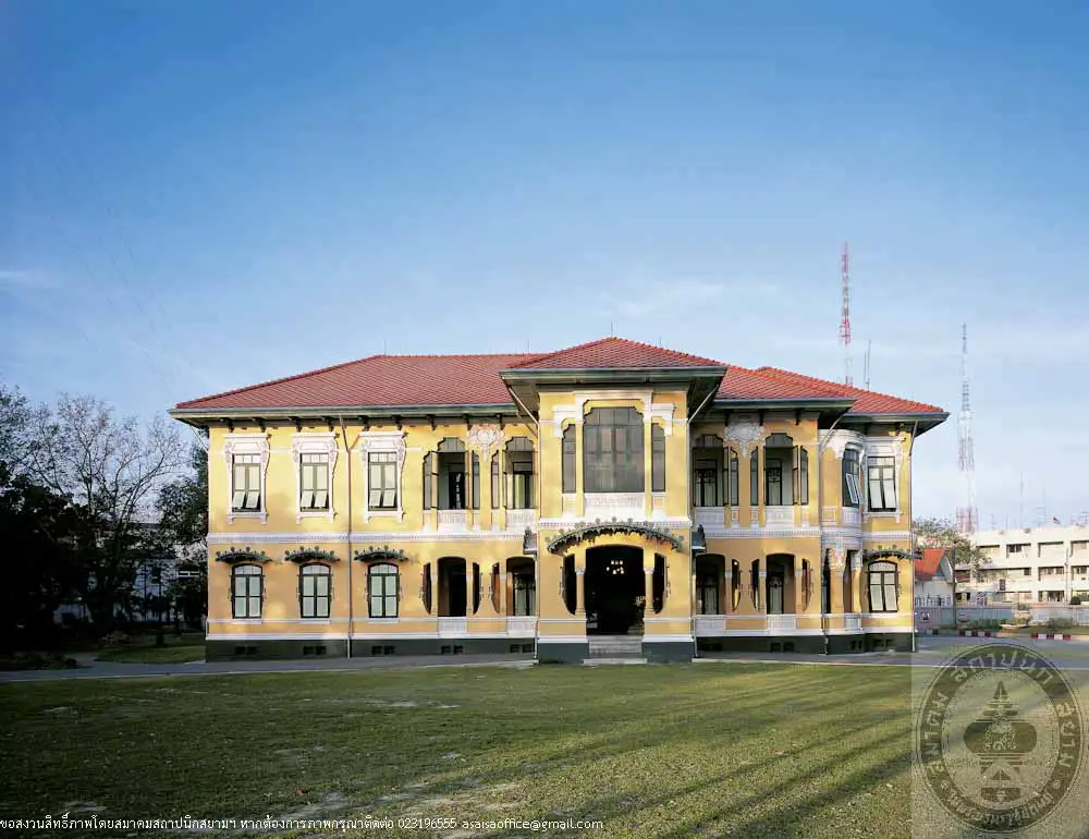 Tamnak Yai is a 2-storey Neo Baroque style building designed by Mr. Mario Tamagno, an Italian architect. The middle porch comprises pillars an arch, above the arch are Palladian motif windows, with a distinguished pair of twisted columns, elaborately decorated with stuccos The left and right wing are asymmetrical, that is the left wing is a 3-storeyed tower whereas the right wing is 2-storey with a curvilinear plan.