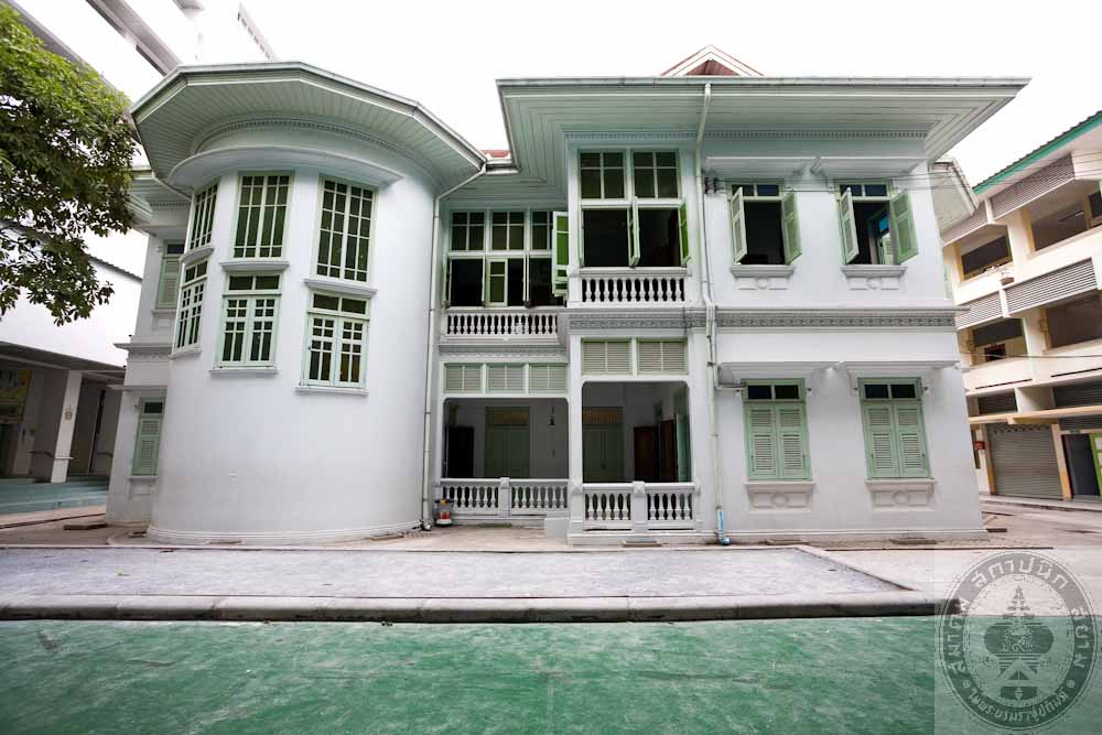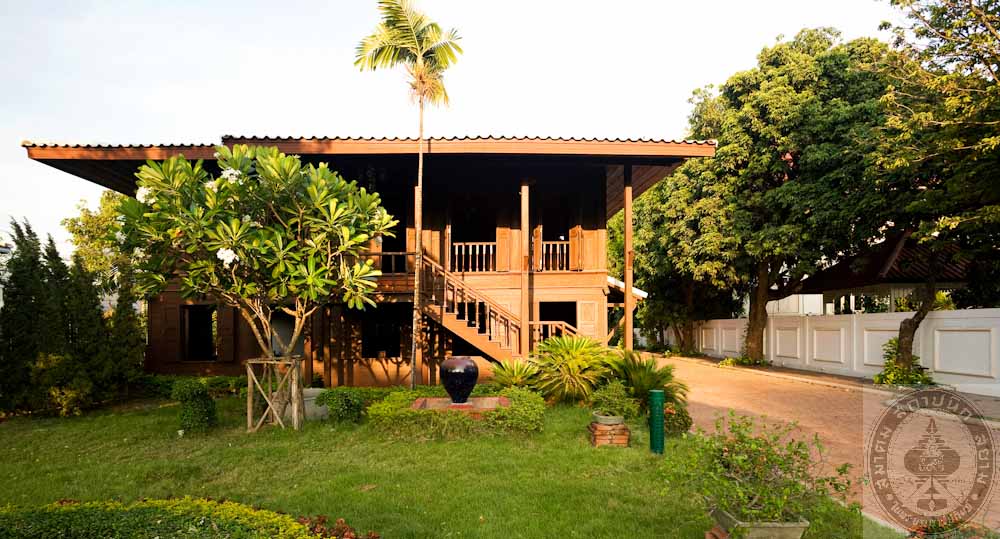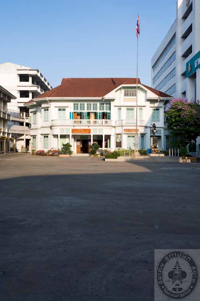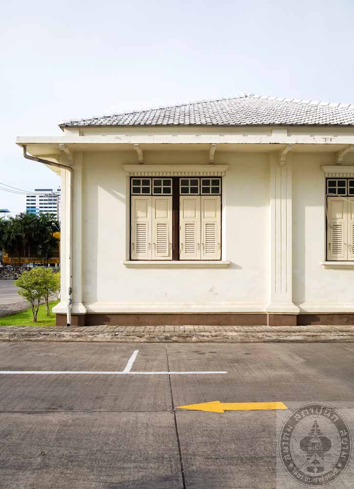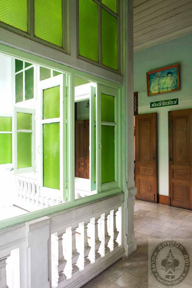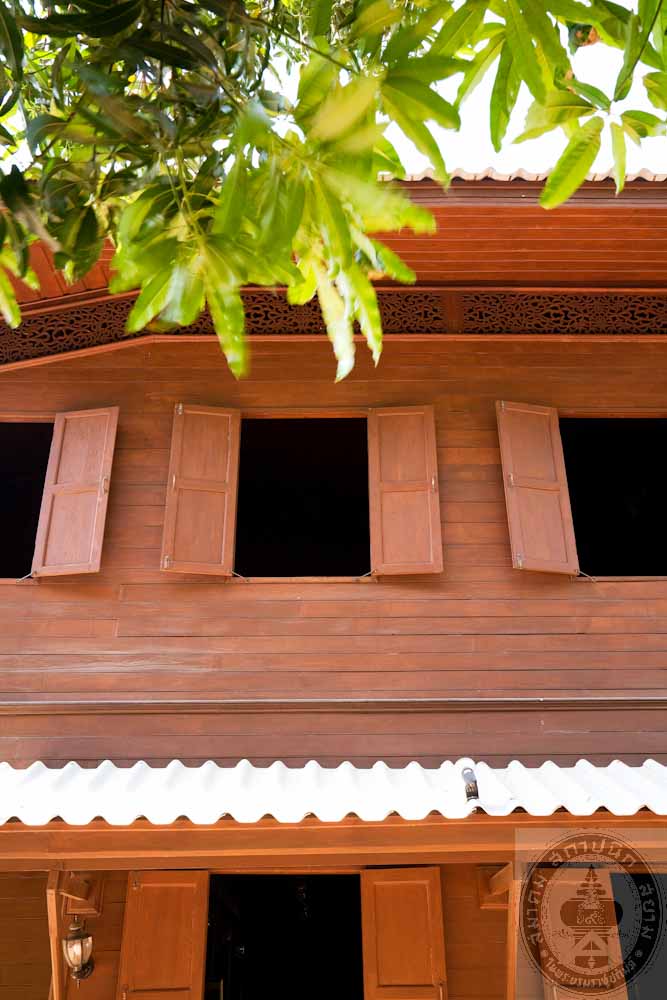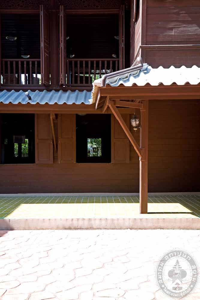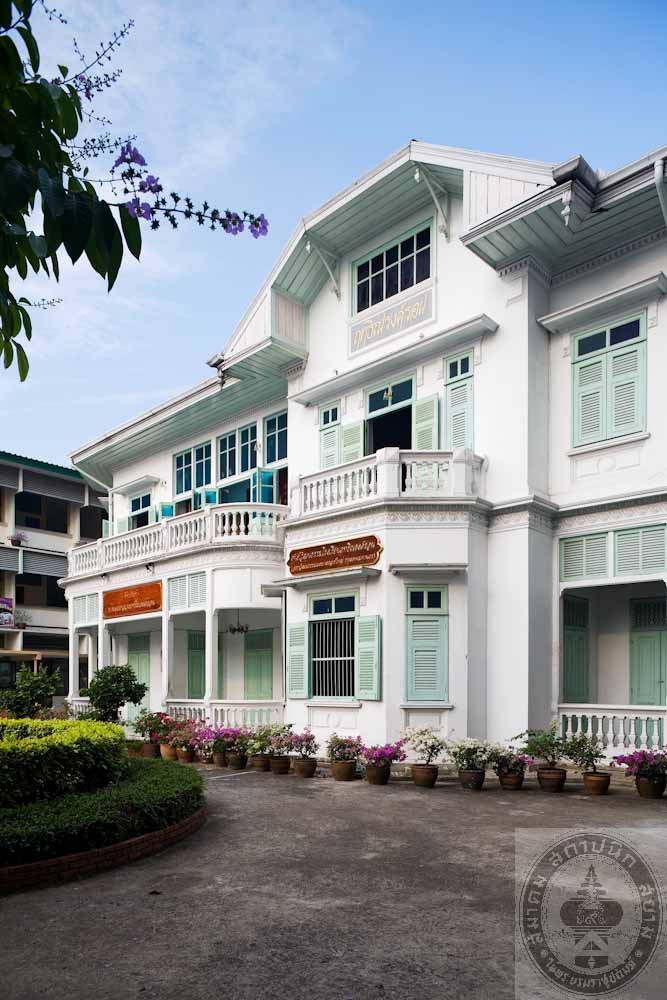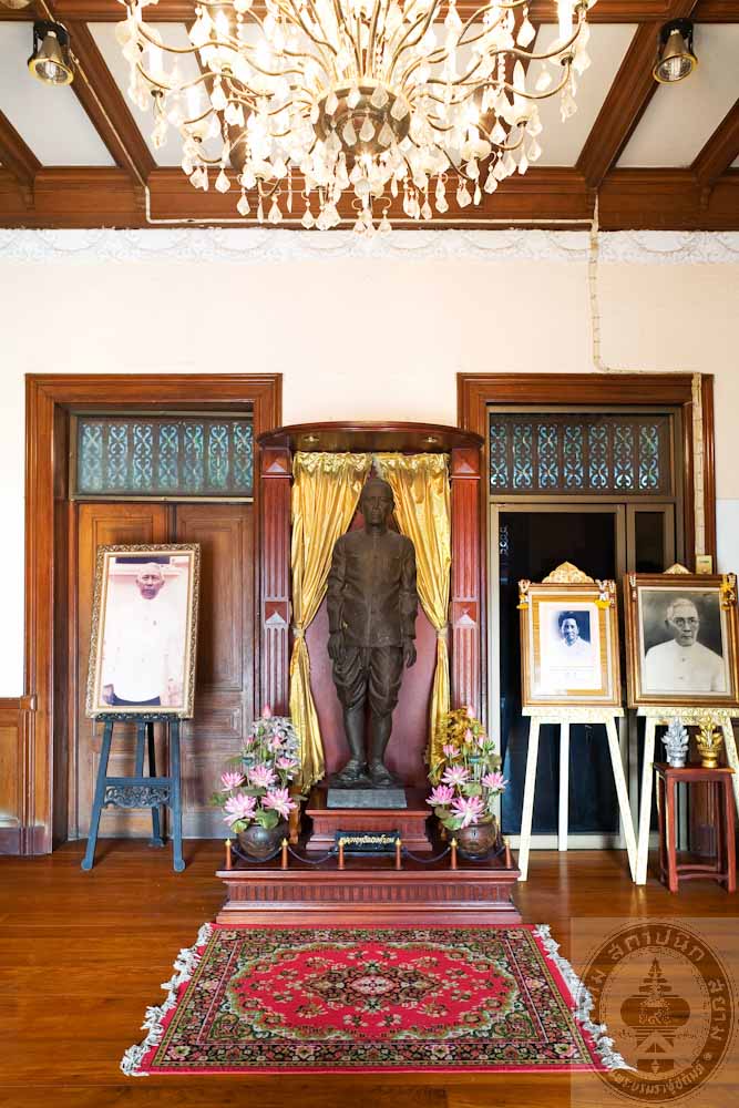 The building was designed and constructed in 1923 by an Italian architect under the “G. KLUZER & CO” construction company. 2 storey high. The building is divided into 3 sections. There is a central hall extending out to two porches. The ceiling is made of wood arranged into squares while doors, windows, stairs, air-vents and floors are made of teak wood. The left side of the building is separated into two small rooms. The right side of the building has a long hall which runs from front to the back which has currently been used as a place where students practice Thai musical instruments. There is no supporting pole behind the hall while steps are laid in a semicircle installed along the curved wall leading up to the entrance. Above the steps are windows and high air passages allowing wind and light to pass through. Inside there is a sculpture and several photographs of his two wives including a portrait of Luang Rit Narong.