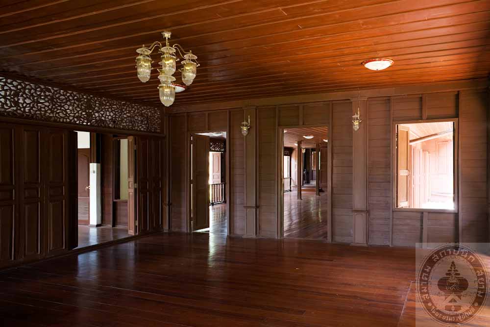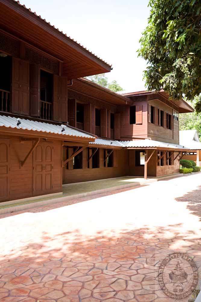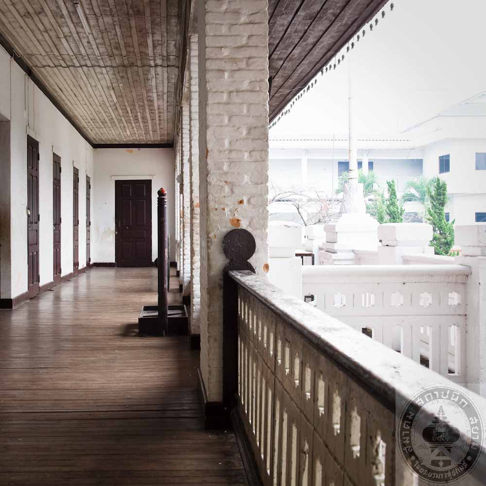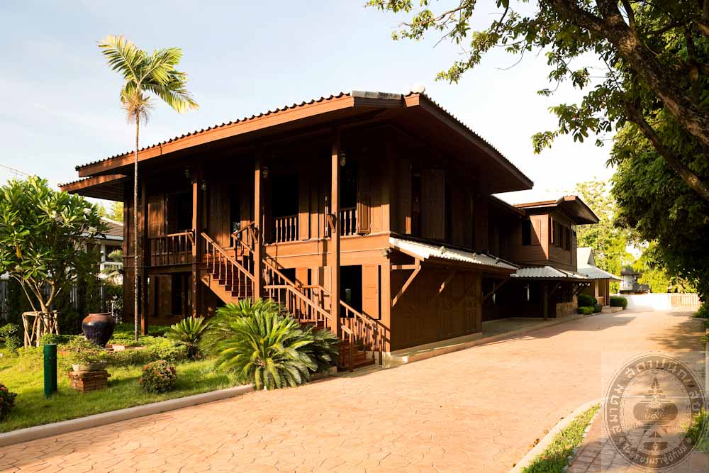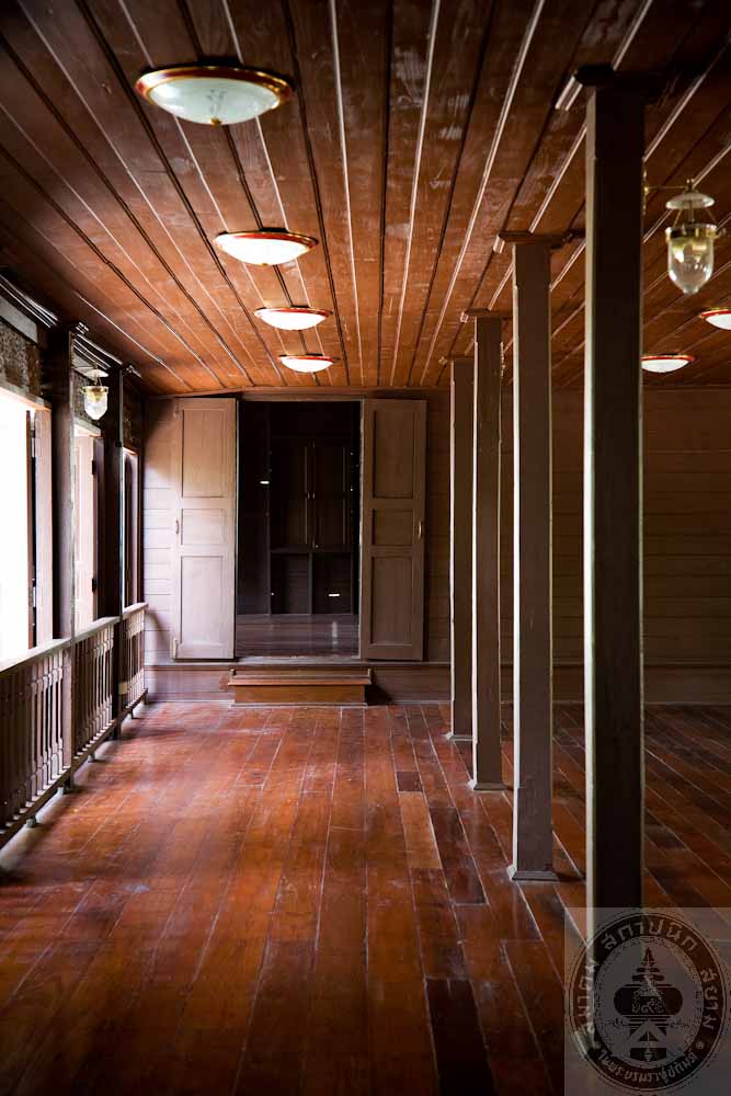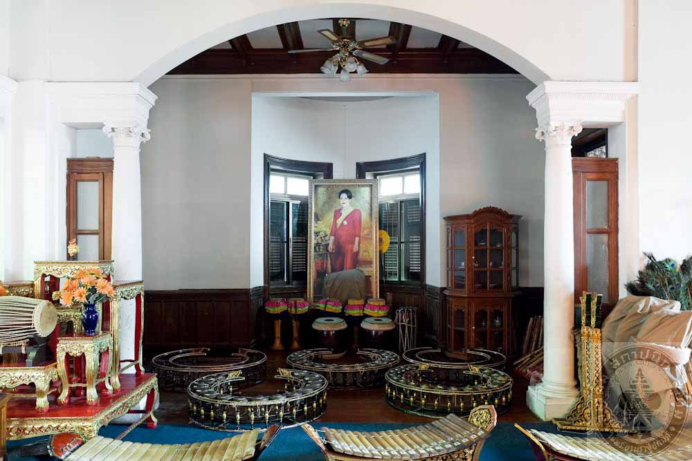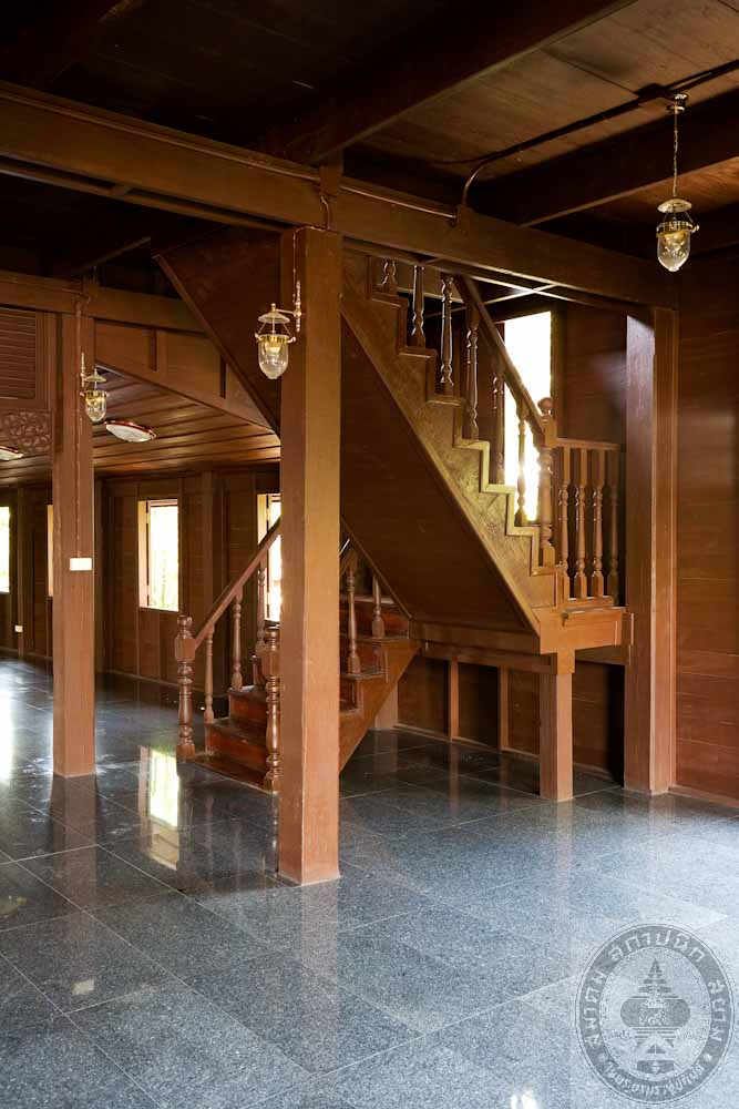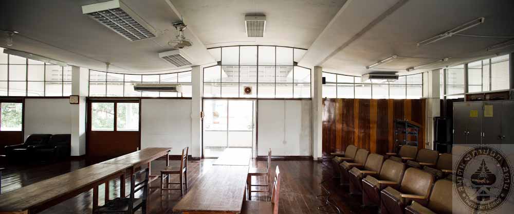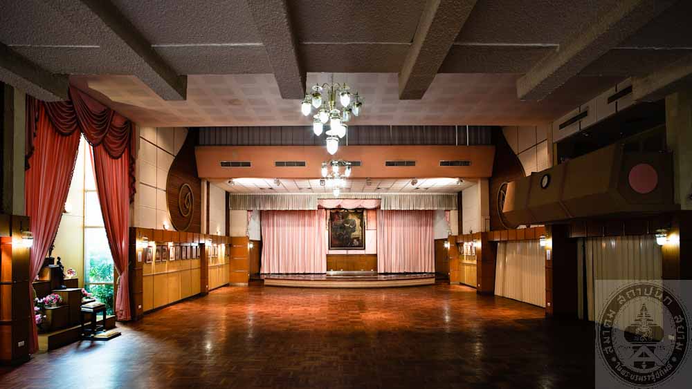 The building was designed and constructed in 1923 by an Italian architect under the “G. KLUZER & CO” construction company. 2 storey high. The building is divided into 3 sections. There is a central hall extending out to two porches. The ceiling is made of wood arranged into squares while doors, windows, stairs, air-vents and floors are made of teak wood. The left side of the building is separated into two small rooms. The right side of the building has a long hall which runs from front to the back which has currently been used as a place where students practice Thai musical instruments. There is no supporting pole behind the hall while steps are laid in a semicircle installed along the curved wall leading up to the entrance. Above the steps are windows and high air passages allowing wind and light to pass through. Inside there is a sculpture and several photographs of his two wives including a portrait of Luang Rit Narong.