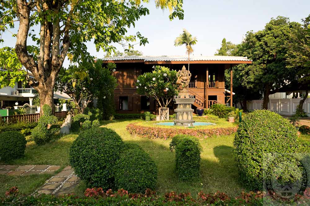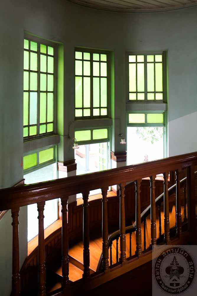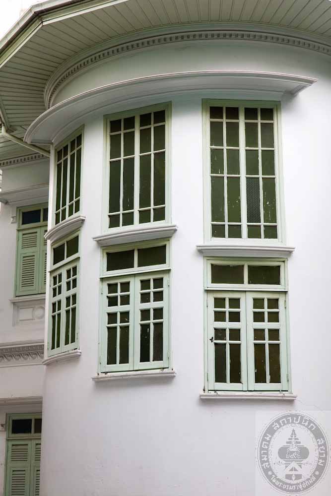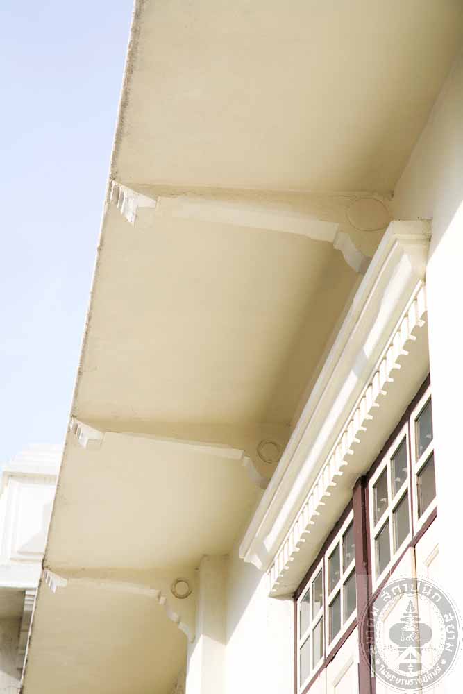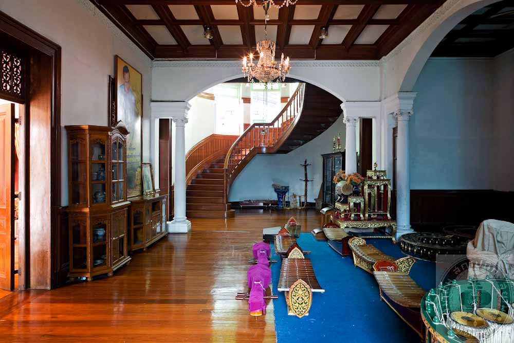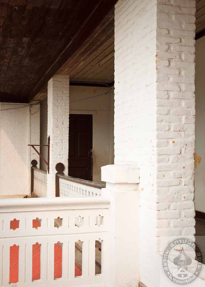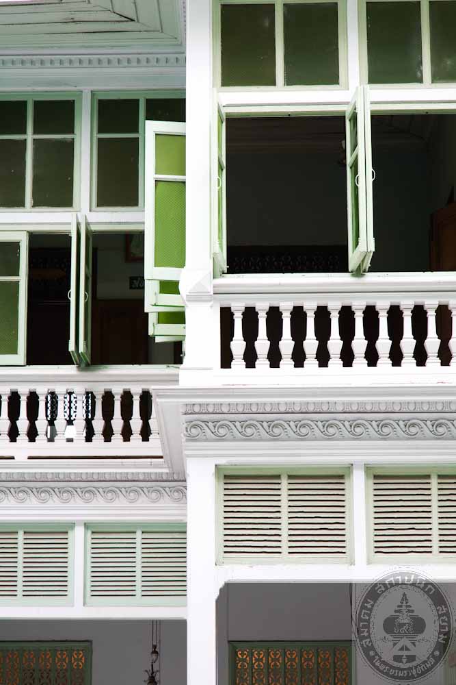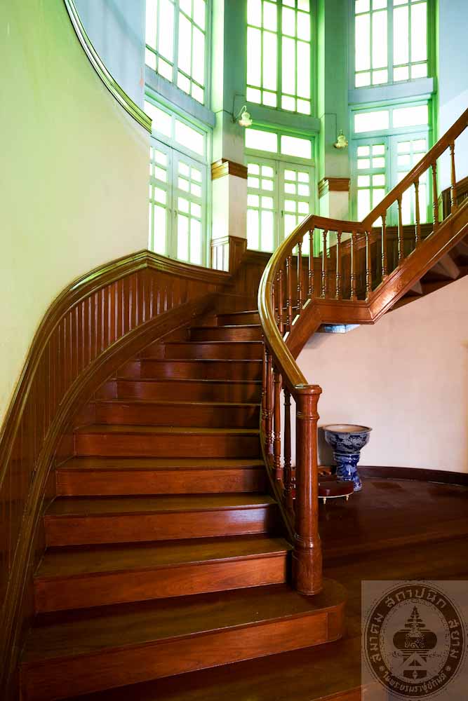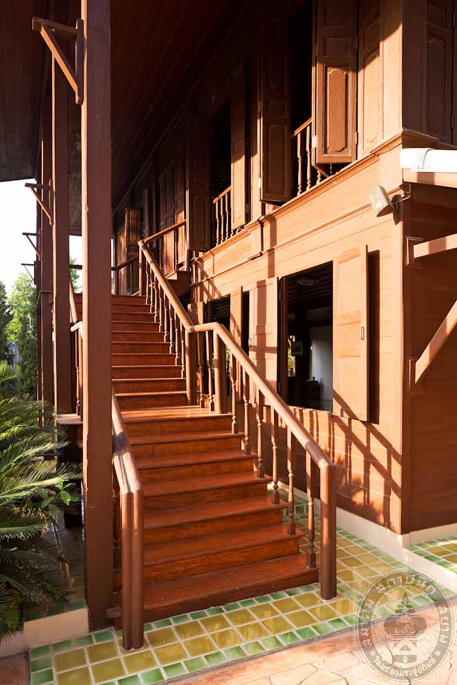 The building was designed and constructed in 1923 by an Italian architect under the “G. KLUZER & CO” construction company. 2 storey high. The building is divided into 3 sections. There is a central hall extending out to two porches. The ceiling is made of wood arranged into squares while doors, windows, stairs, air-vents and floors are made of teak wood. The left side of the building is separated into two small rooms. The right side of the building has a long hall which runs from front to the back which has currently been used as a place where students practice Thai musical instruments. There is no supporting pole behind the hall while steps are laid in a semicircle installed along the curved wall leading up to the entrance. Above the steps are windows and high air passages allowing wind and light to pass through. Inside there is a sculpture and several photographs of his two wives including a portrait of Luang Rit Narong.