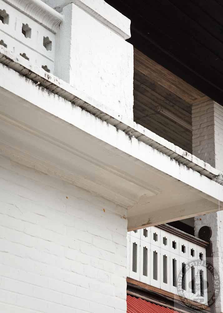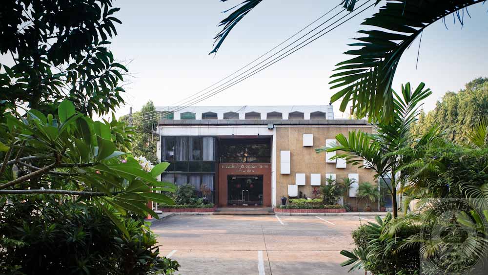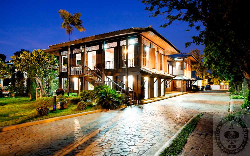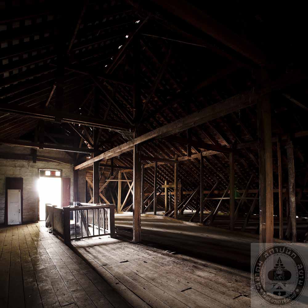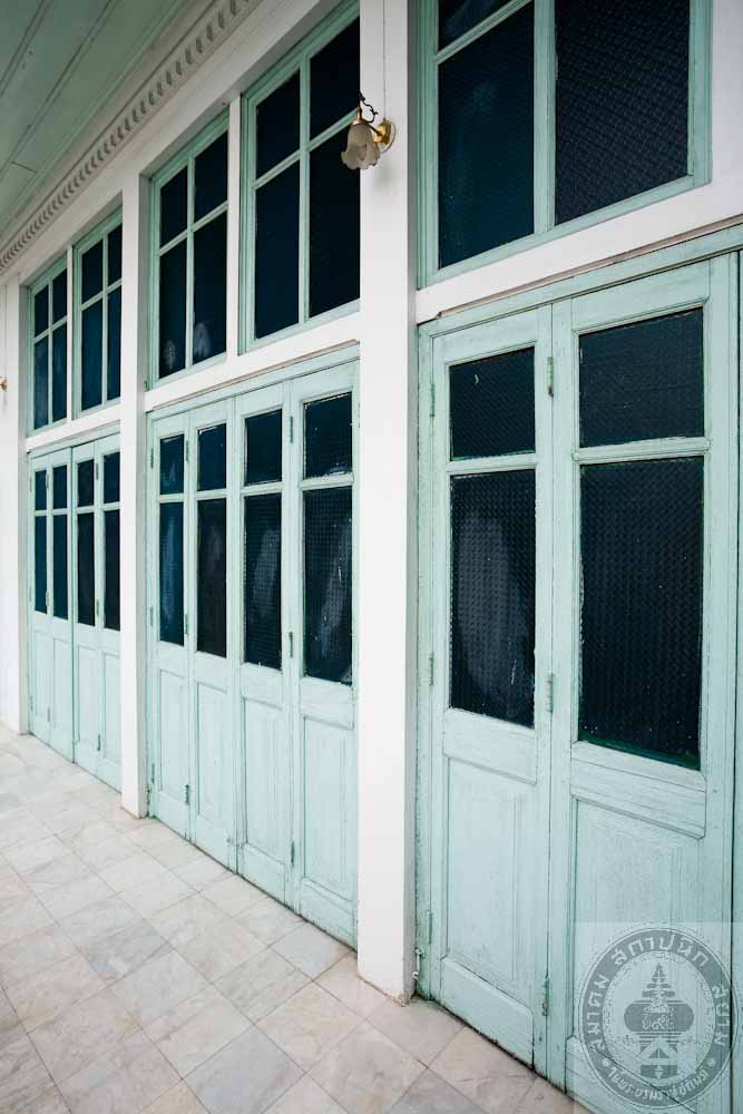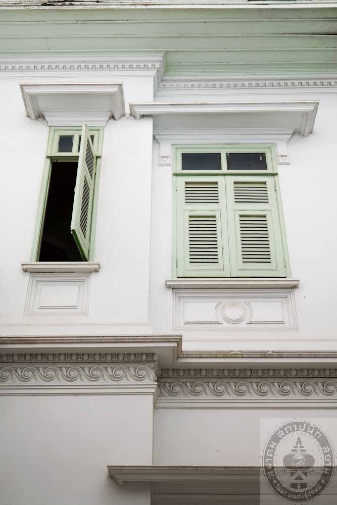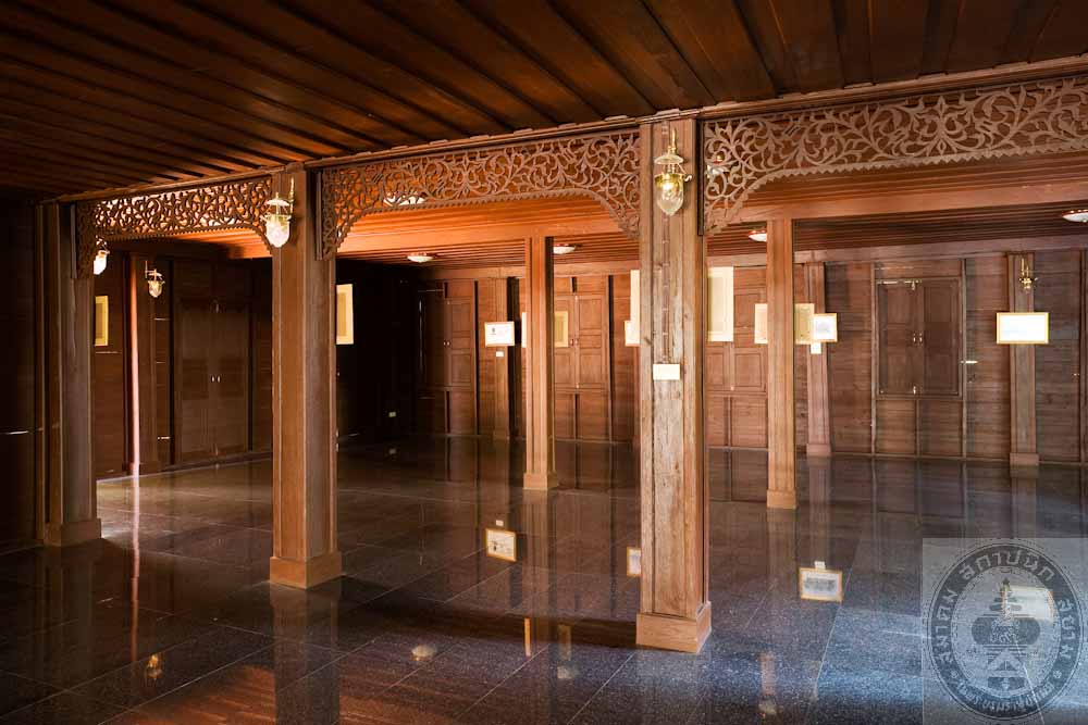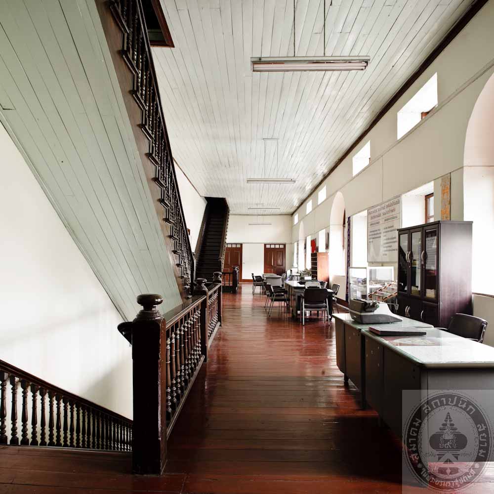 The building was designed and constructed in 1923 by an Italian architect under the “G. KLUZER & CO” construction company. 2 storey high. The building is divided into 3 sections. There is a central hall extending out to two porches. The ceiling is made of wood arranged into squares while doors, windows, stairs, air-vents and floors are made of teak wood. The left side of the building is separated into two small rooms. The right side of the building has a long hall which runs from front to the back which has currently been used as a place where students practice Thai musical instruments. There is no supporting pole behind the hall while steps are laid in a semicircle installed along the curved wall leading up to the entrance. Above the steps are windows and high air passages allowing wind and light to pass through. Inside there is a sculpture and several photographs of his two wives including a portrait of Luang Rit Narong.