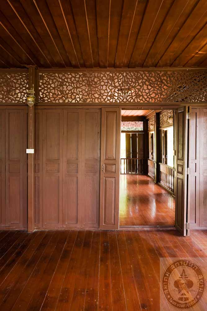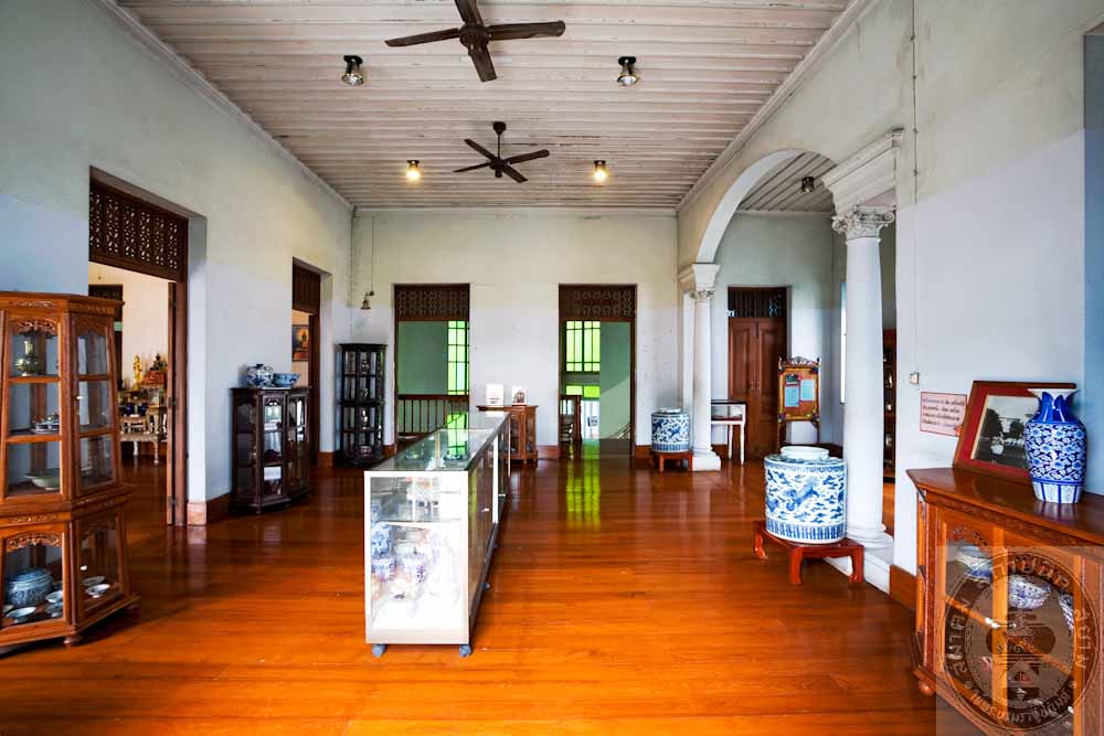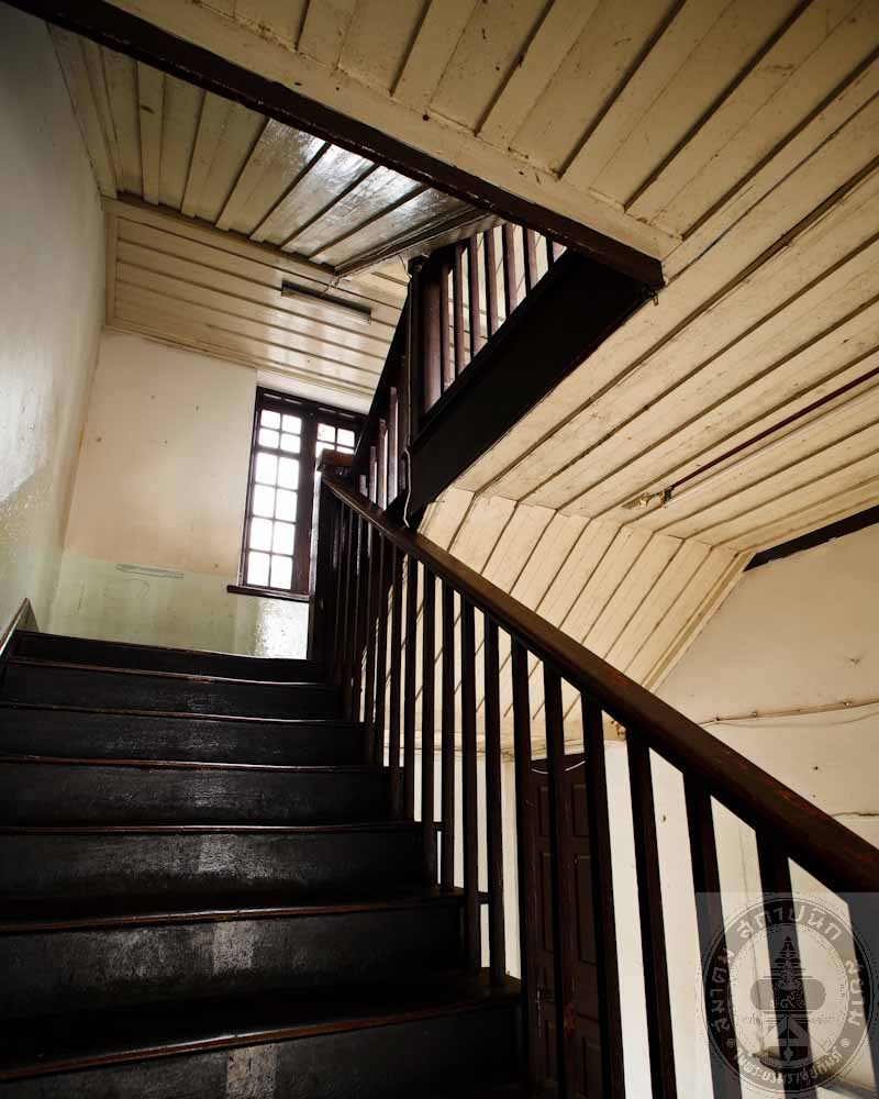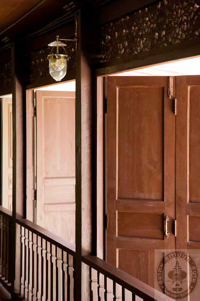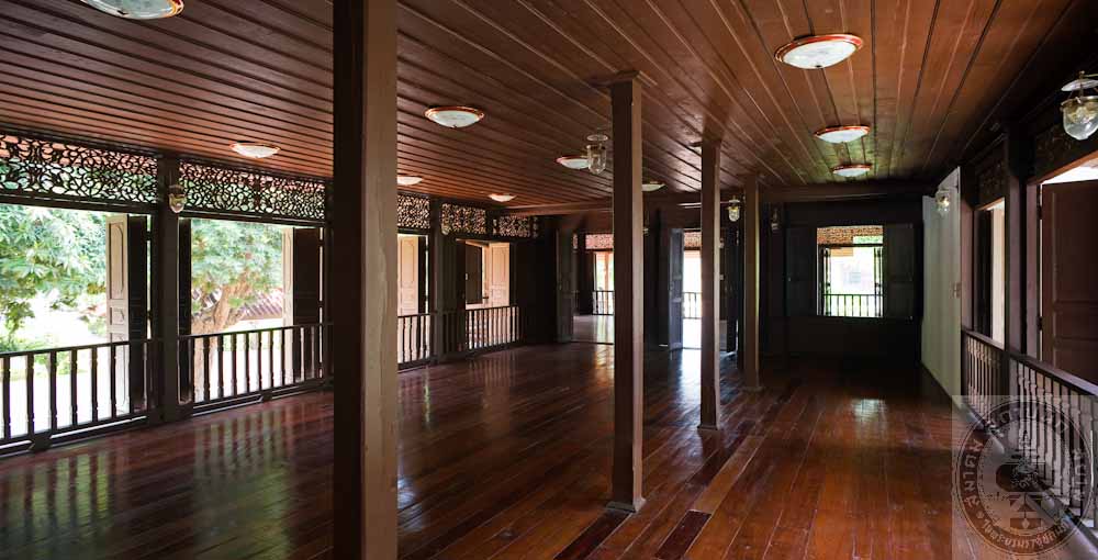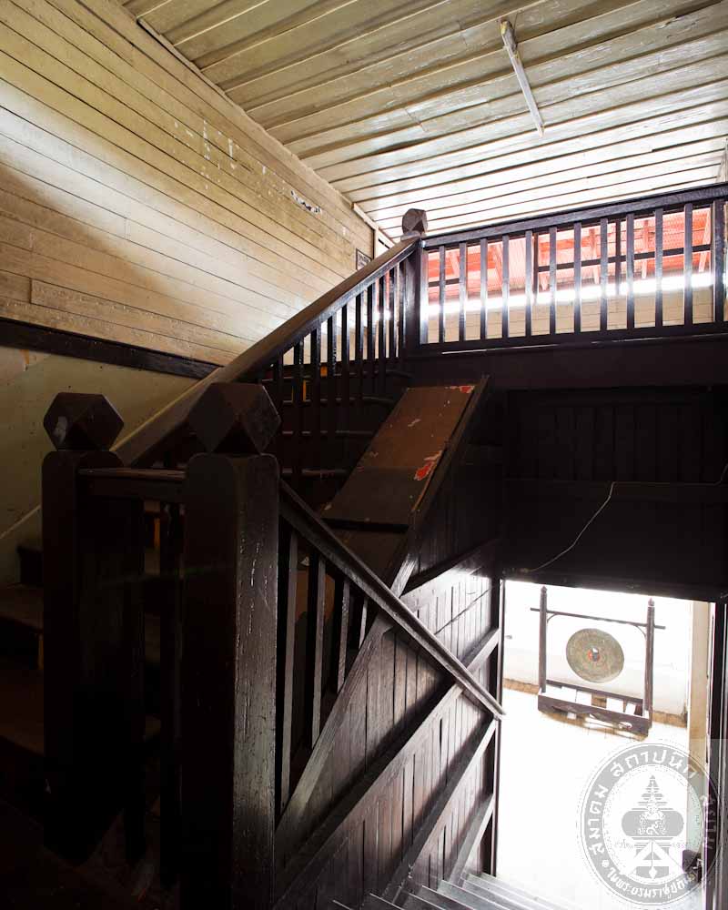 The division of rooms upstairs is similar to the layout downstairs. Chinese porcelains borrowed from Wat Sang Kra Jai temple and numerous items donated by the community are exhibited upstairs. The middle room used to be his bedroom, consisting of two doors on each side adjoining other rooms. The front room now hosts a portrait of either King Rama V or King Rama VI (the face is not clear). The small room in the back exhibits donated Thai costumes and local arts and crafts.