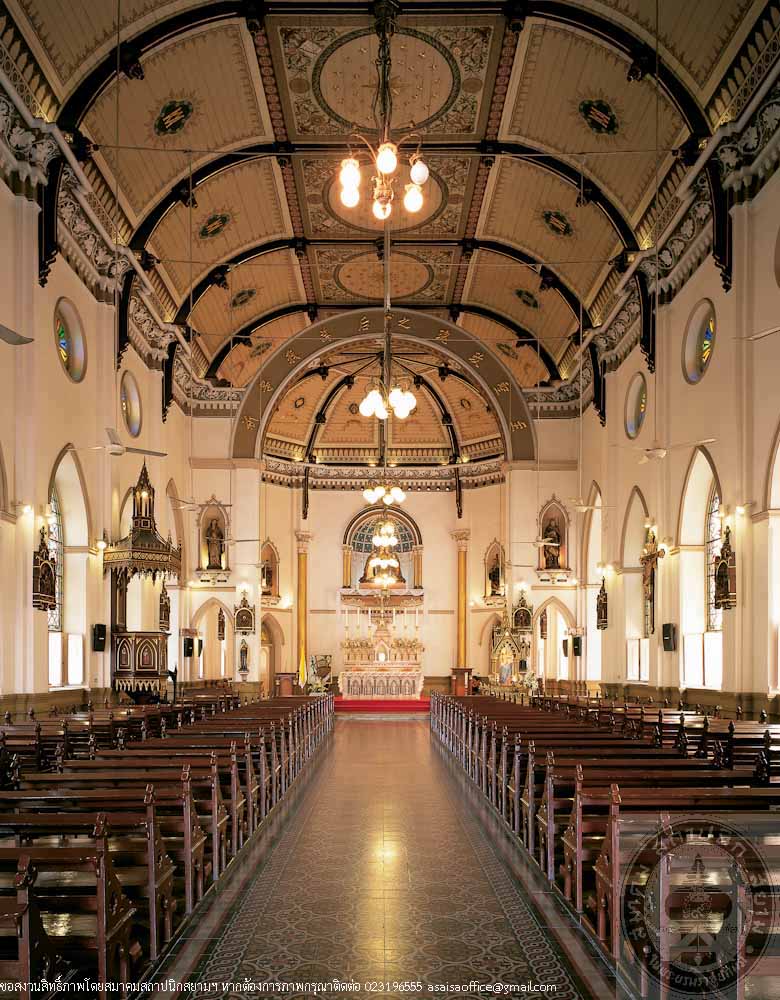 The present church, the third of this temple, was built during 1891 – 1897. Its architecture is Gothic Revival style with a cross-shaped plan, facing the front façade comprises a spired bell tower with a cross at the top, point arched gate, and high pitched Gothic gable. The walls are decorated with stained glass depicting scenes from the Bible, which are amongst the most beautiful ones in Thailand. The church has celebrated its 100th Anniversary in 5th October, 1997.