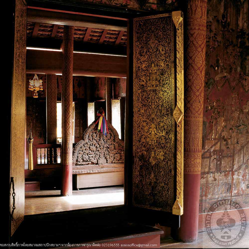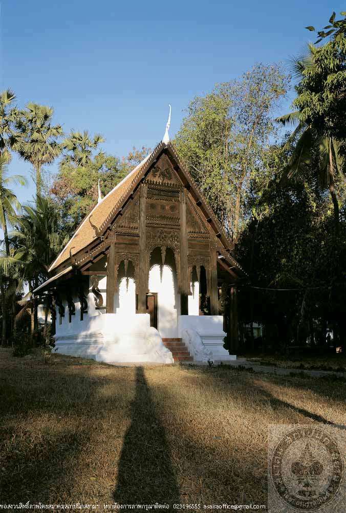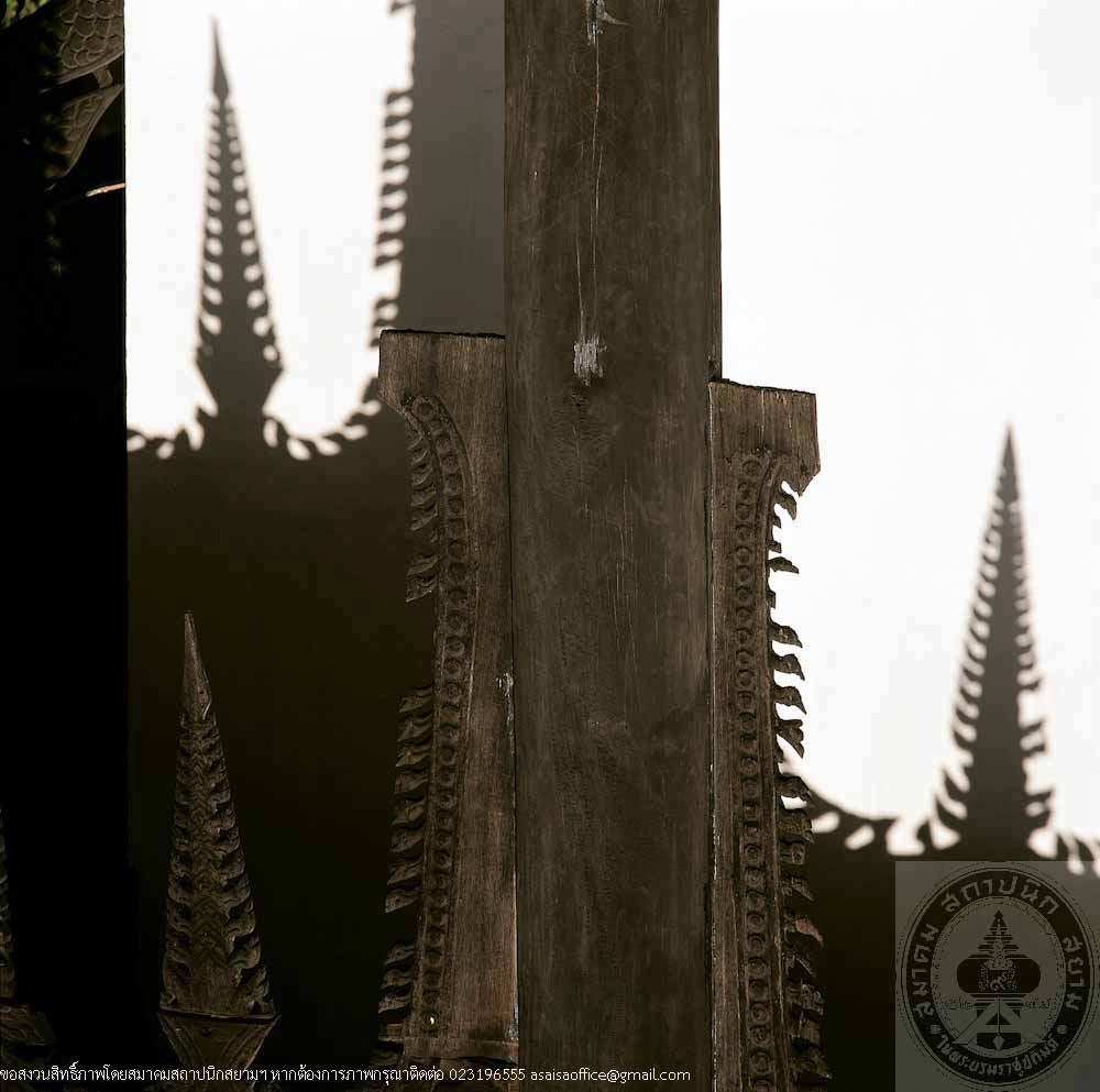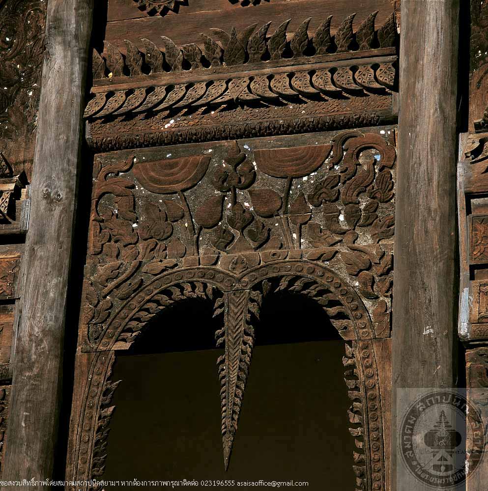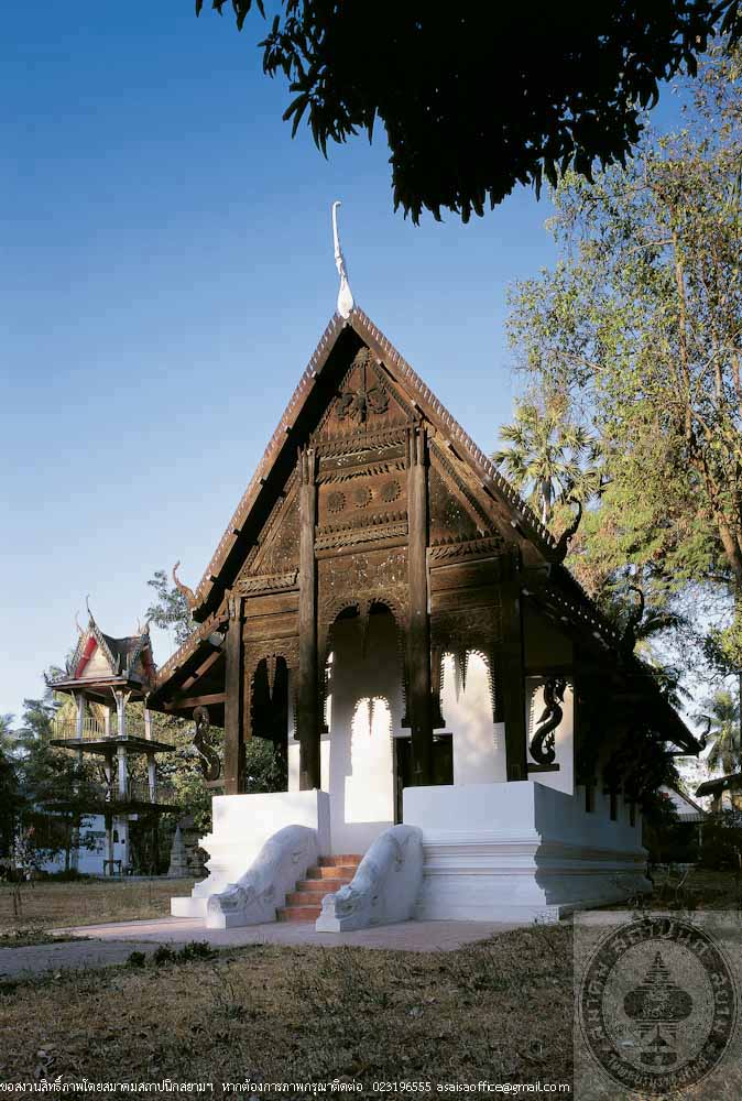Sim or Ordination Hall at Wat Chaeng is a walled structure on high raised floor with an open porch at the front, Northeastern Thai architecture of Ubon School. Distinguished features are its beautiful proportion and fine decorative elements i.e. front pediment of woodcarvings which depict Erawan, the three-headed elephant of the God Indra flanked by two mythical lions, and lotus, symbol of Ubon Ratchathani. Although its roof style and decorations indicate the Lan Chang (Laos) influences, the solid, simple form and details such as the crocodile-flanked staircase belong particularly to Northeastern, or Isan style.