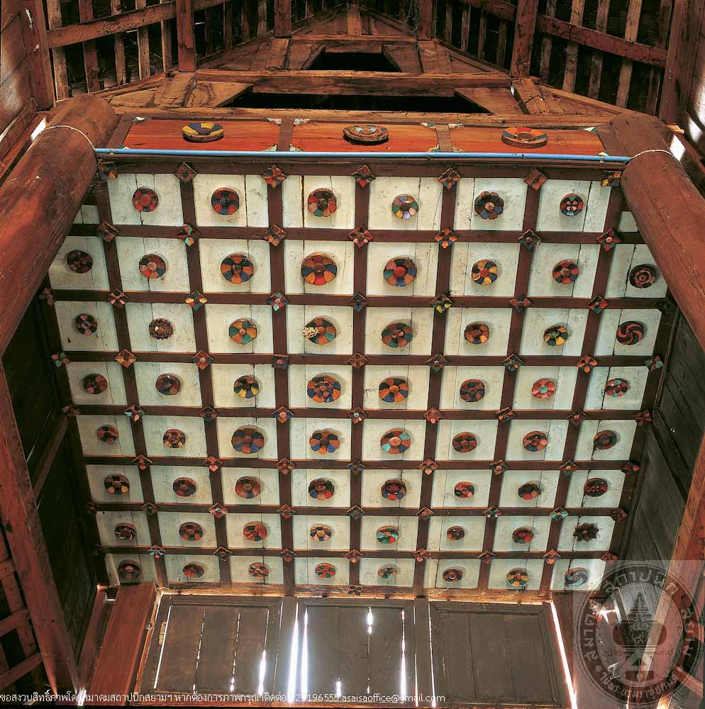 The he vihara at Wat Sob Li is an enclosed rectangular hall with 2-tired roof. There are 3 pairs of pillars inside the hall, which can be entered by three entrances on the eastern, northern and southern sides of the building. The structure is timber, roofed with teak shingles, and decorated with local style woodcraving.