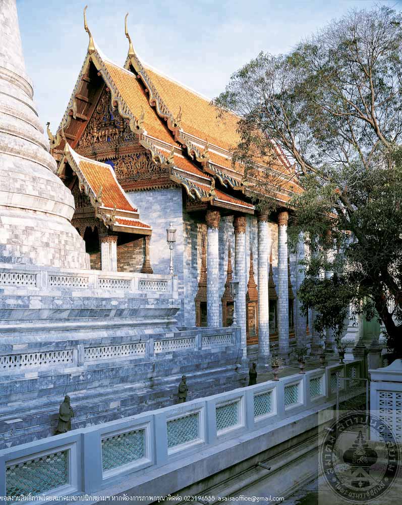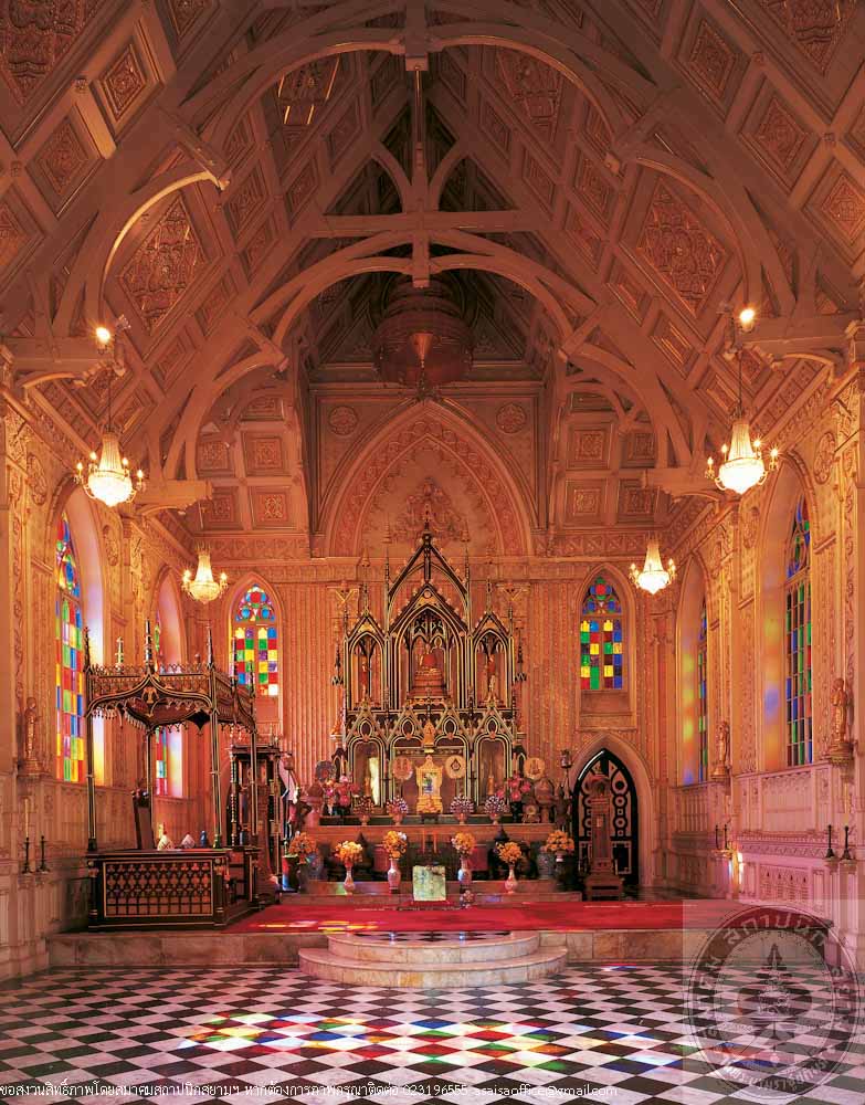 Its European appearance is commendably well-adapted to Buddhist functions and traditional characteristics, for instance, its overall decoration is with stuccos and stained glass, the principle Buddha’s image, Phra Phutthanaruemonthammopat, is enthroned on high pedestal under a Gothic arch, King Rama V’s image is depicted in the French stained glass window on the arch above the entrance, and a spired bell tower is located at the rear, similar to a Christian church.