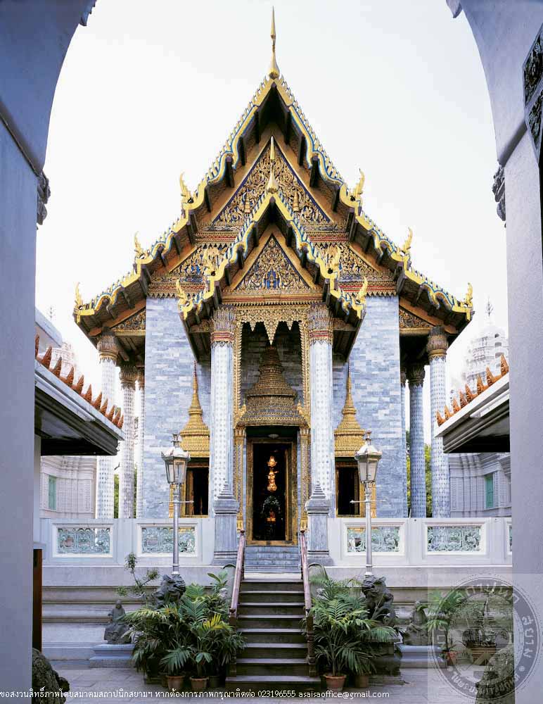 The Grand Vihara, which is also called Ubosatha or ordination hall, is a building of traditional Rattanakosin style with porches at the front and rear. The roof is decorated with glided ornaments and coloured glass mosaics. The Royal Seal of King Rama IV is depicted with gilded lacquer on the pediment. The rear wall of the building is installed with inscriptions on the date of establishment and the circumscription of the temple’s sacred boundary (Sema). It is to be noted that that sacred boundary or Sema at this temple is as an ordination hall because it is also include in the sacred area.