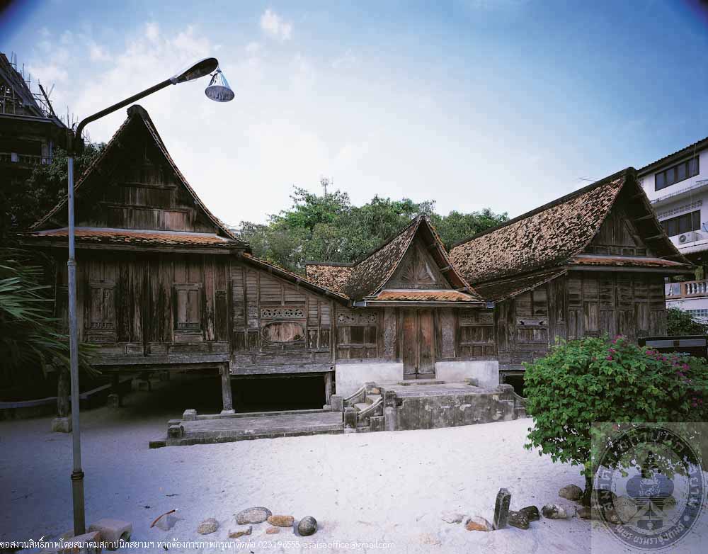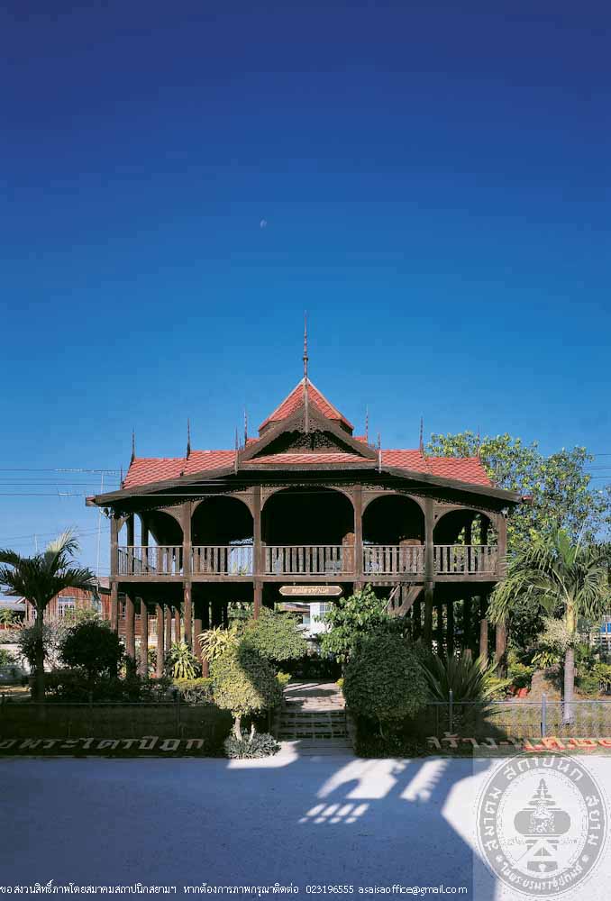 Ho Phra Traipidok (Scriptures Hall) at Wat Tha Khae is a square-planned wooden structure built on high stilts. The roof is 4-porched with 3 tiers, decorated with fretwork in floral design. The inner hall is surrounded by folding panels decorated at the bottom parts with woodcarving, and the upper parts and fitted with glass panes. The hall can be reach by 11-step staircase, which leads to the verandah. Inside the hall stand scripture cabinets with fine decorations of woodcarving and coloured glass mosaics. It was built in the period of the 5th abbot, Phra Khru Simma, in 1923. The abbot had memorized the Burmese style to be applied to the building design. Builders were 2 Hainanese craftsmen. The underfloor area was also used as a classroom of Wat Tha Khae School.