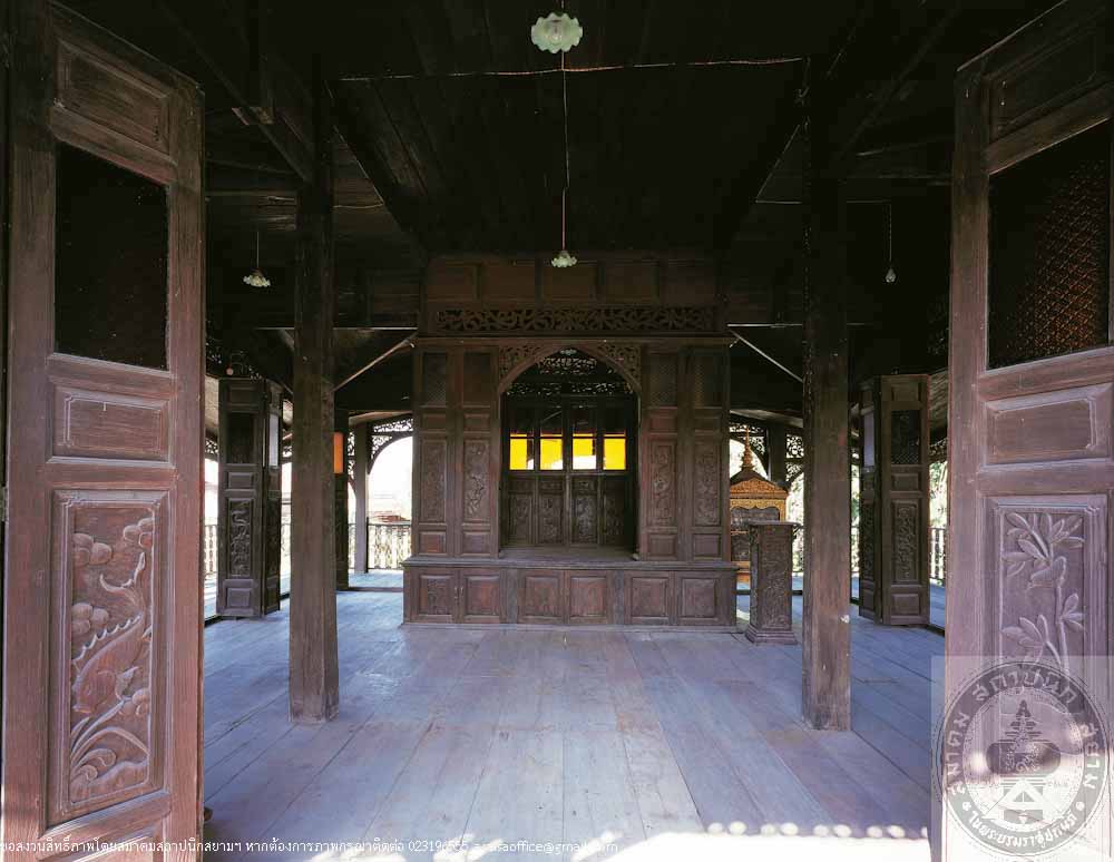 Phra Thi Nang Songtham was originally a wooden building but the style was change during the reign of King Rama III by adding exterior walls made of plastered brick masonry as appears nowadays.
