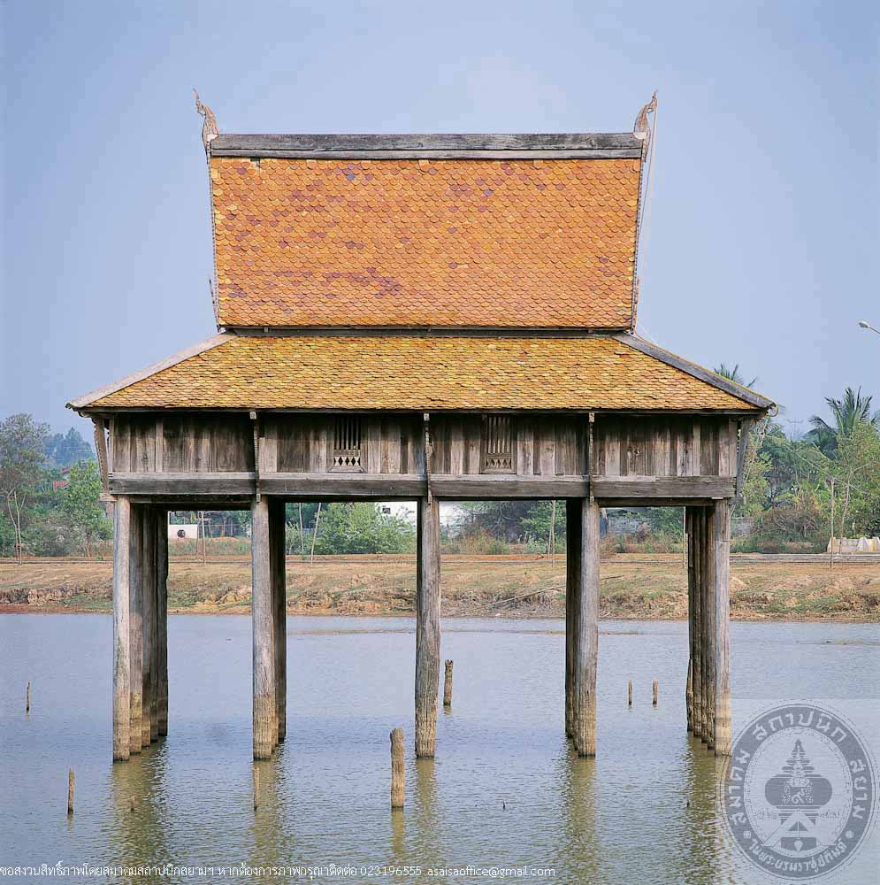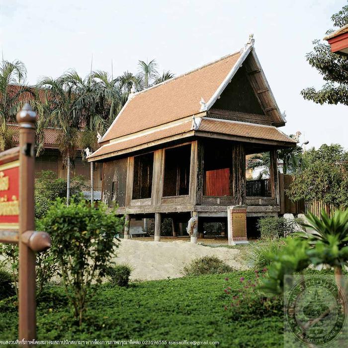 Wat Sai is located on the bank of Khlong Dan (Dan canal). It has been an important temple since Ayutthaya period, with evidences of several red sandstone Ayutthaya style Buddha images discovered in the temple precinct as well as in the canal in front of the temple. Significant structures are pagoda, bell tower, and Tamnak Phra Chao Suea, also known as “Tamnak Thong” (Golden Pavilion). Dated back to Ayutthaya period, or approximately 300 years ago, the building was built by order of Somdet Phra Sanphet VIII (Phra Chao Suea), who favoured traveling in the countryside, to be his residence during the trips along Khlong Dan, a route which leads to the sea. Some said that King Thai Sa also used to stay at this pavilion as well.