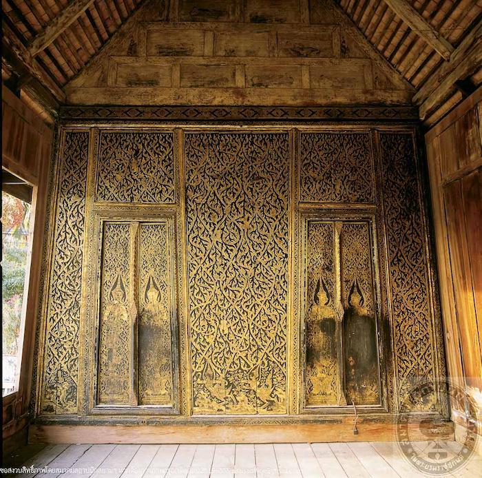 The architecture of Tamnak Phra Chao Suea is Thai traditional style, built of teakwood on high stilts. The original decorations were gilded lacquer works but most of them have faded. Merely in the interior partitions that the gilded decorations still remain in almost complete state. The inside of the building was divided into the King’s bedroom and private chambers. The bedroom was adorned with false windows, whose frames were elaborately carved and gilded in lion-foot designs and ravishing motifs. However, they have been partly deteriorateddue to the old age. H.R.H. Prince Krommaphraya Narisara Nuvadtivongse wrote that the carvings at Tamnak Thong were the craftsmanship of Ayutthaya period; whereas the gilded designs were the exquisite work of Bangkok period, prior to the reign of King Rama III. It could be summarized from the Prince’s comment that the pavilion has been restored during Rattanakosin period. Gilded lacquer works were added. The roof of the pavilion was created in gable tiled form and decorated at the top with stucco depicting a Garuda. Gable ends were made in shape of Nagas. The roof design was finished with a lower tier hipped roof spreading around the building.