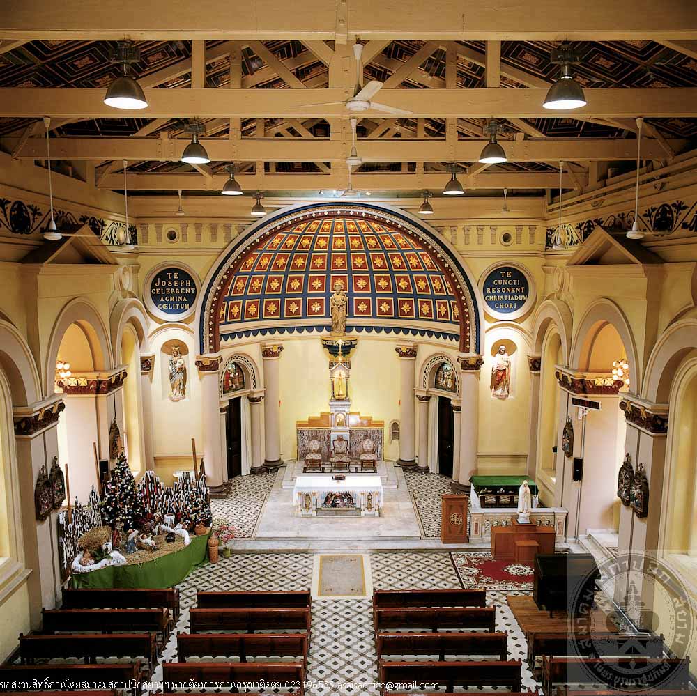 Its architecture style is Romanesque Revival designed by Father Perros in collaboration with Mr. Joachim Grassi, an Italian architect. The plan of the church is cross-shaped, 23.11 x 42.74 metres, lies on northeast – southwest axis, and faces Chao Phraya river. The structure is wall-bearing, with a distinctive spire on the top of a tower and arched stained glass windows depicting the stories from the New Testament. Above the doors are stained glass panels which illustrate the history of the church. The altar is under an arch whose ceiling was decorated with stuccos. There are arched niches on the walls enshrining statues of St. Joseph and other saints. The floor of the sacred area and altar were paved with marbles while other parts of the building were groundcovered with cement tiles. The interior is high-ceilinged, with a dignified and sacred atmosphere of a long-established Catholic church.