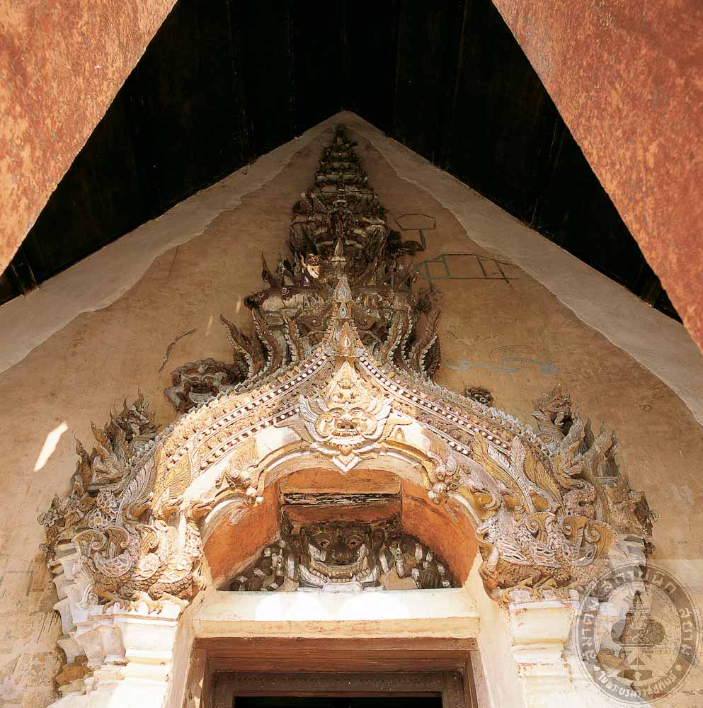 Valuable elements of the assembly hall are, for instance, stucco decorations on the gateway, capitals, and the guardian animals at the base of the stairs, which are fine works of art. There are also wood carvings seen on the gable and decorative panels between columns with lacquered and gilded decoration, colored glass mosaics and paints. The brackets are painted carved wood in vernacular style. The exterior walls on both sides of the doorway are decorated with mural paintings depicting local scenes, which nowadays are much deteriorated and decayed. This vihara is considered as an ancient monument with great preservation of values and authenticity.