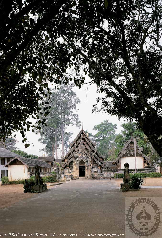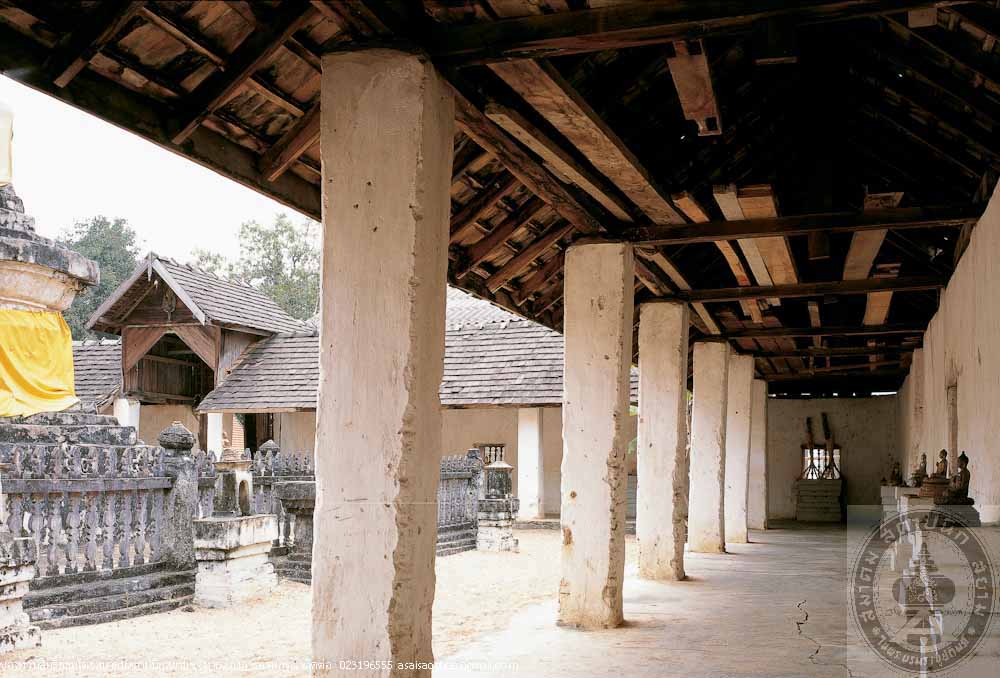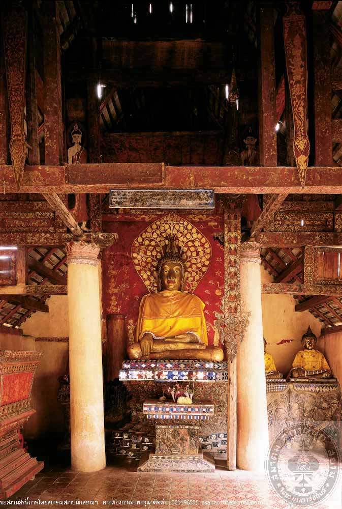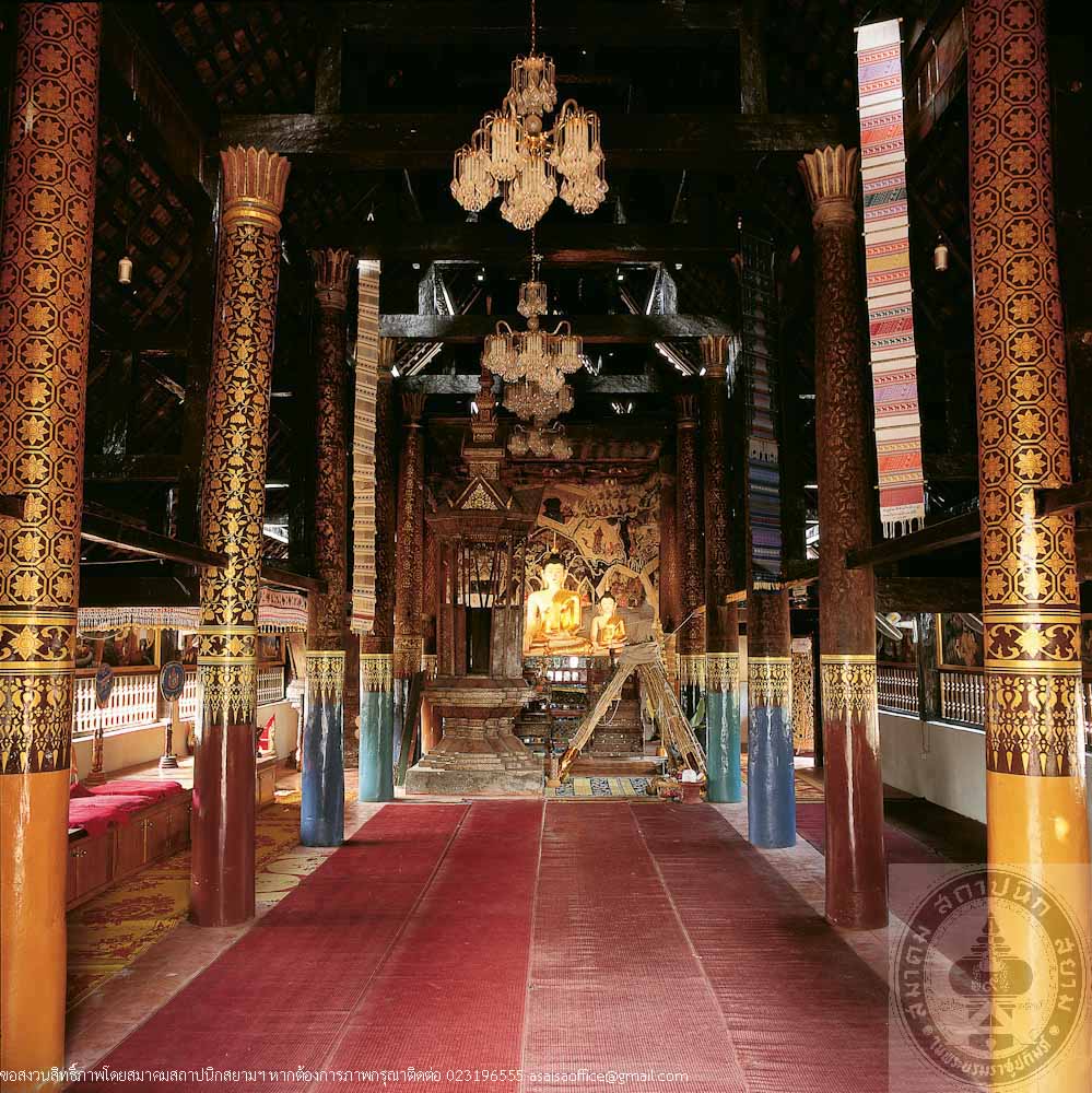 Inside the Vihara stands round columns finishing of goldleaves on red lacquer. Several valuable religious objects are presented i.e. ancient preaching seat decorated with beautiful stuccos on the base, Sattaphan (candle stand) elaborately made in distinctive style of Nan, and a complete set of regalia comprising the Buddha image, 8 pieces on each side.