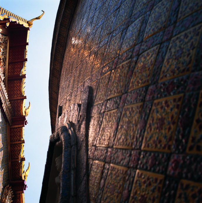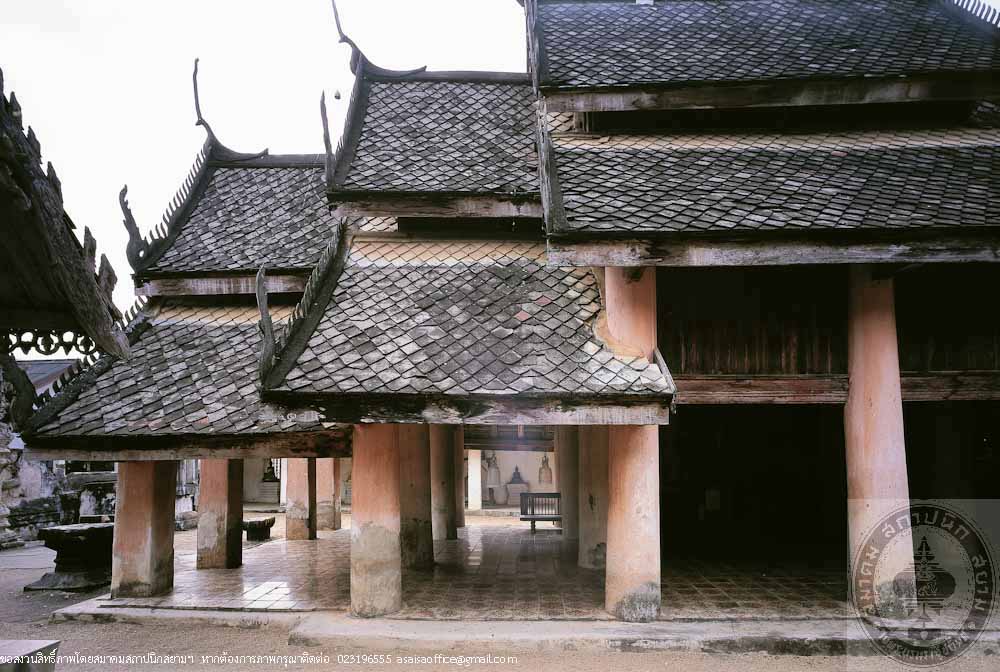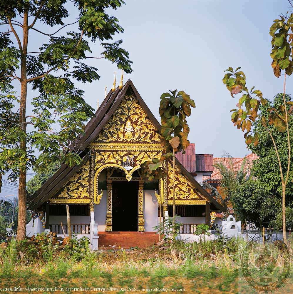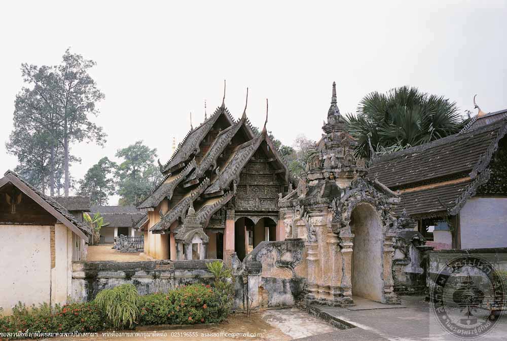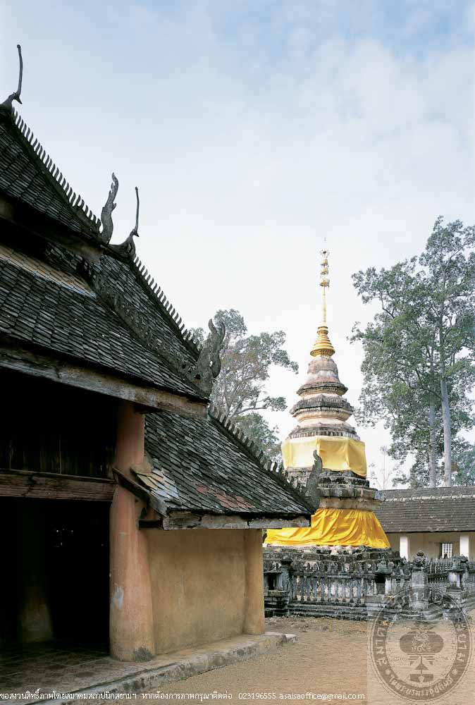 Inside the Vihara stands round columns finishing of goldleaves on red lacquer. Several valuable religious objects are presented i.e. ancient preaching seat decorated with beautiful stuccos on the base, Sattaphan (candle stand) elaborately made in distinctive style of Nan, and a complete set of regalia comprising the Buddha image, 8 pieces on each side.