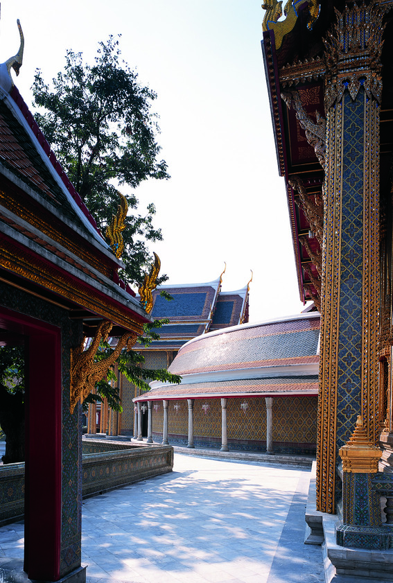 Gallery: is the element that connects the Ubosatha, 2 directional Viharas, and Vihara together. The gallery plan is circular, surrounding the pagoda in its centre, with outer columns made of marble, inner columns made of brick with capitals decorated with gilding and coloured glass mosaics. Other important structures in the Buddhawas are i.e. Phra Wihan Thit (Directional Vihara), Koei (platform for mounting royal vehicle), Phlapphla Plueang Khrueang (dressing pavilion), and gateway whose gable panels are decorated with Phra Kiao, the royal emblem of King Rama V.