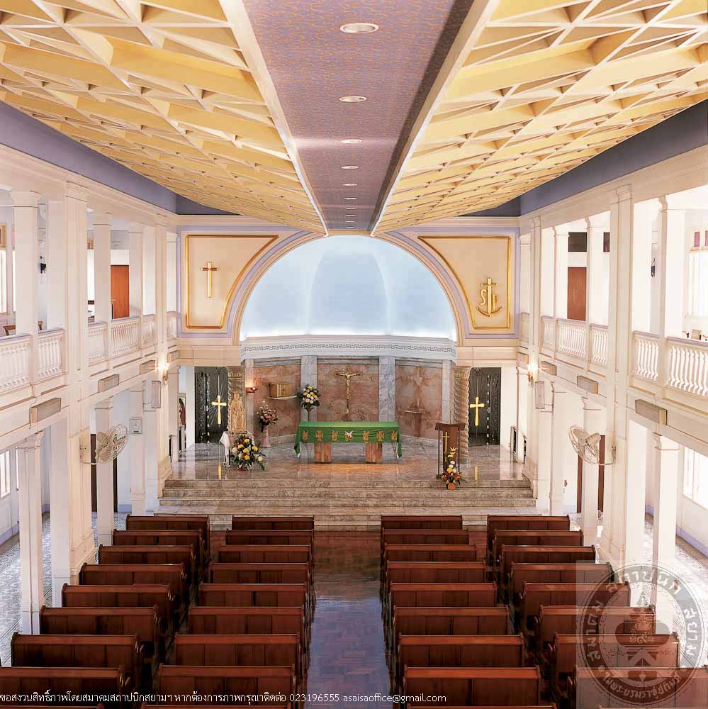 The Chapel is 3-storey ferro concrete building with a rectangular plan with Classic Revival architecture, the work of Mr. Rigazzi. Architectural elements and orders emphasize serenity and dignity. The Chapel features a nave flanked by 2-storey galleries and a Palladian Motif apse. The walls are fitted with wooden louvre windows for good ventilation, suitable for the climate in Thailand.