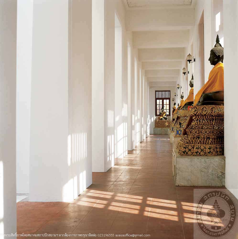 Another special feature of the Ubosatha is its interior decoration which applies a mix of European and Thai styles, that is, the ceilings, columns, and gilded wall designs are in European Rococo style, said to be similar to a hall in Versailles Palace of France; the original mural paintings on upper part of the walls depicts the Life of the Buddha, designed and painted by Mom Chao Prawit Chumsai; the principal Buddha image is Phra Phuttha Angkhiroat seated on a marble pedestal ordered from Italy. Later, King Rama VII had the original paintings removed andrepainted in golden falling flowers design, and added some designs to the walls between column bases and behindthe Buddha image. When King Rama VII passed away, his relics and ashes were buried at the Buddha image pedestal.