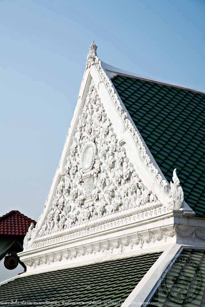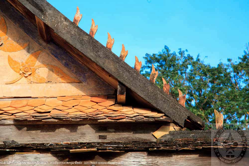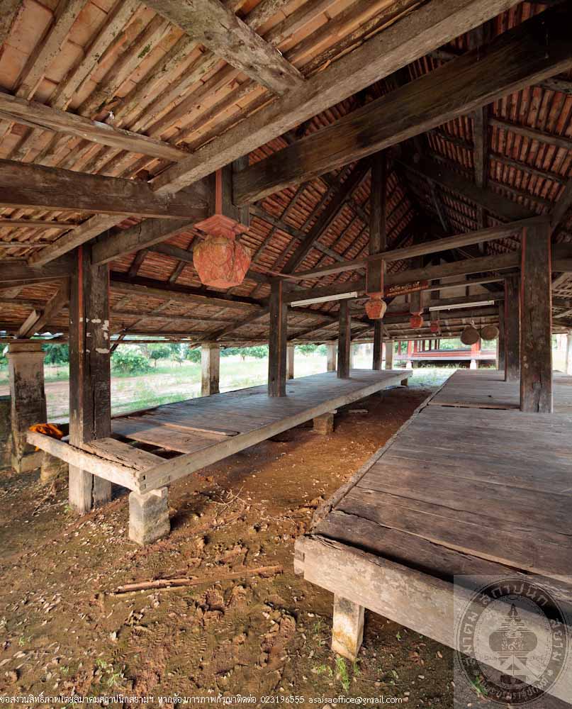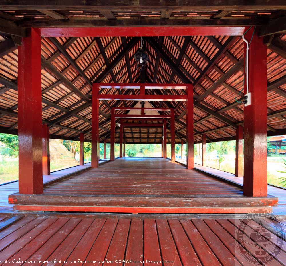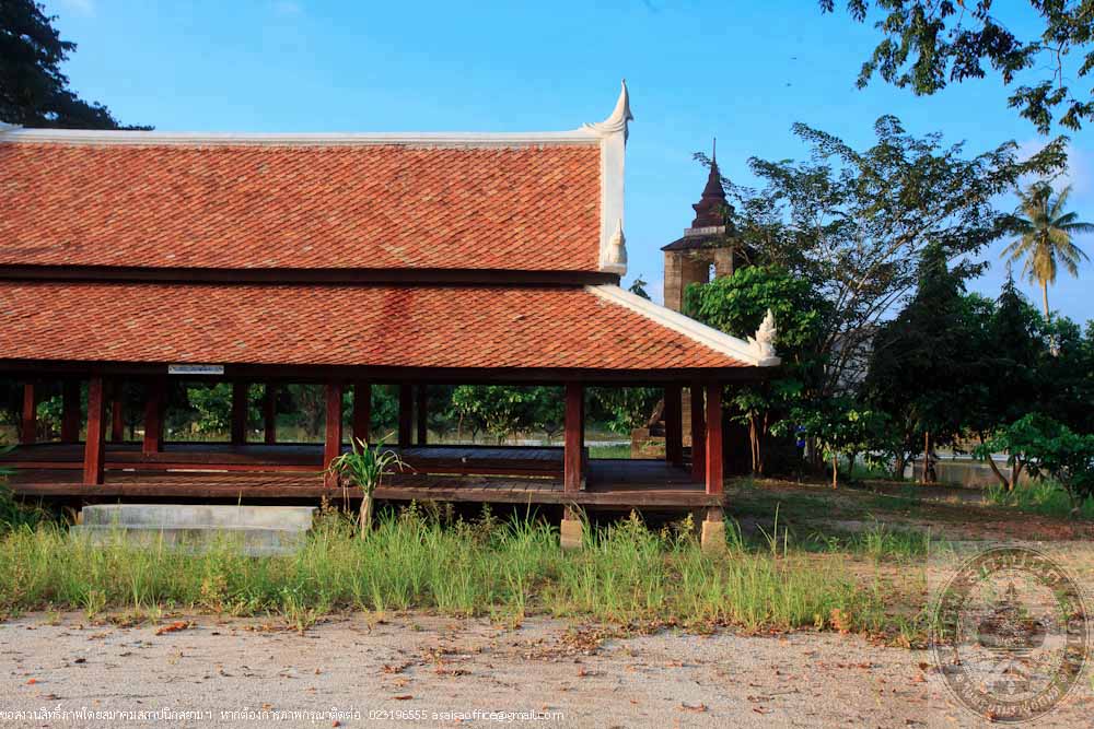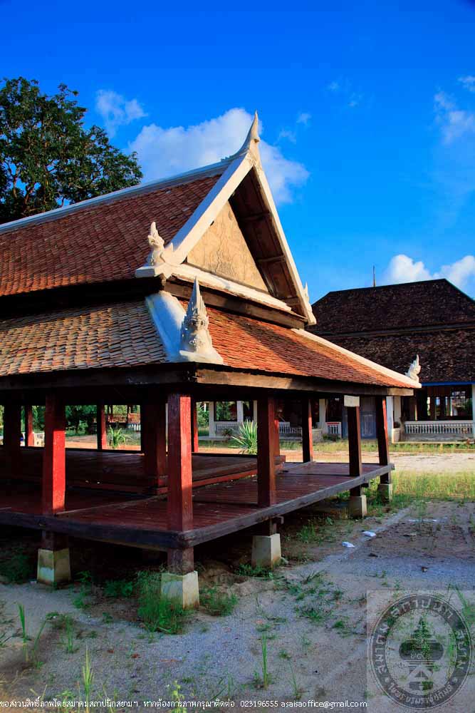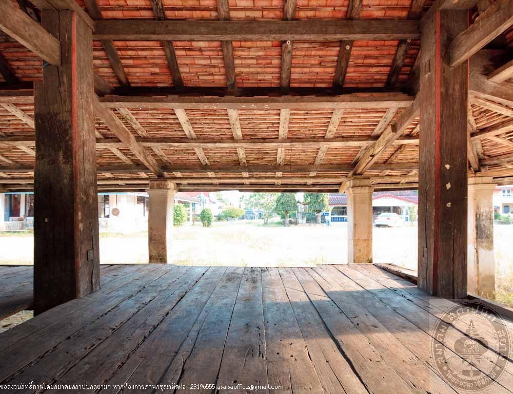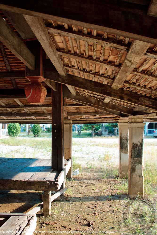 The main structure of the pavilion is made of hardwood called Mai Kiam, a reserved and endangeredlocal wood. The plan is in a rectangle pattern of 6.50 metres wide and 11.50 metres long. The high woodenplatform placed on concrete columns. The floor beams are connected to the columns by ancient traditional method. The wooden floor has 2 levels and the middle part is raised up 0.30 metres above the terrace, which is a typical local style of the South. The gable roof is covered with orange clay tiles. The gable is decorated with stucco in Burmese or Mon art style. The color of the building is the natural color of wood. The factory making the clay tiles of the roof is located near the temple and still in operation.