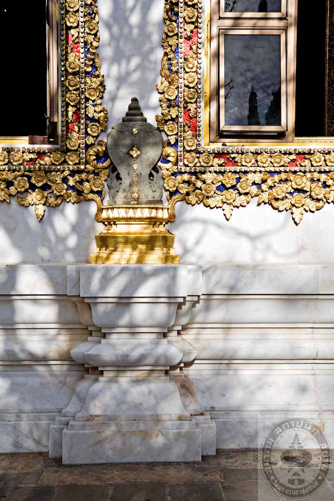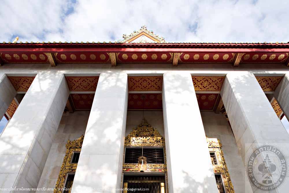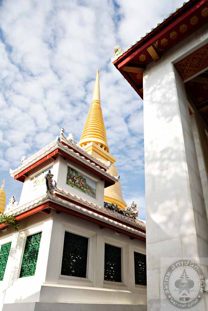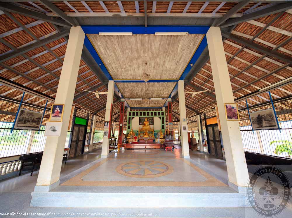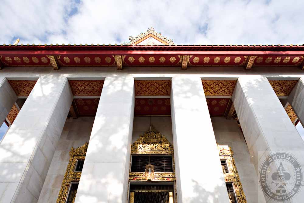 The design of the ordination hall is in the applied Thai style of art with a tetrahedron structure of ferro concrete with3 tiered roof. The gallery is around the building with 4 assembly halls at the 4 corners. The door and window panels are painted in Lai Rodnam (a Thai traditional design). The ceiling is decorated with gilded metal stars. The monk’s quarters consist of 14 buildings of ferro concrete. Each building has 2 storey.