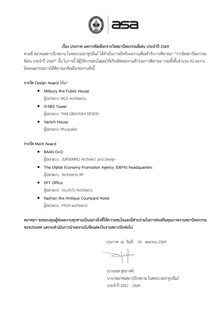 ประกาศผลการคัดเลือกผลงานรางวัลการออกแบบสถาปัตยกรรมดีเด่น ประจำปี 2569 (ขั้นตอนที่ 1) (ประกาศ ณ วันที่ 26 ม.ค.69)
