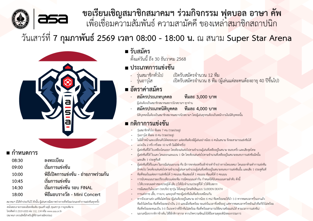 ASA CUP 2026 + Add to Google Calendar + iCal / Outlook export 00 days 00 hours 00 minutes 00 seconds Date Feb 07 2026 Time 08:00 - 21:00 Share this event ใบสมัคร