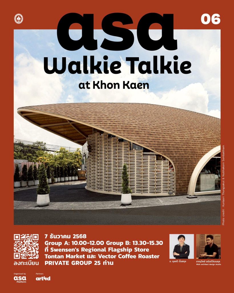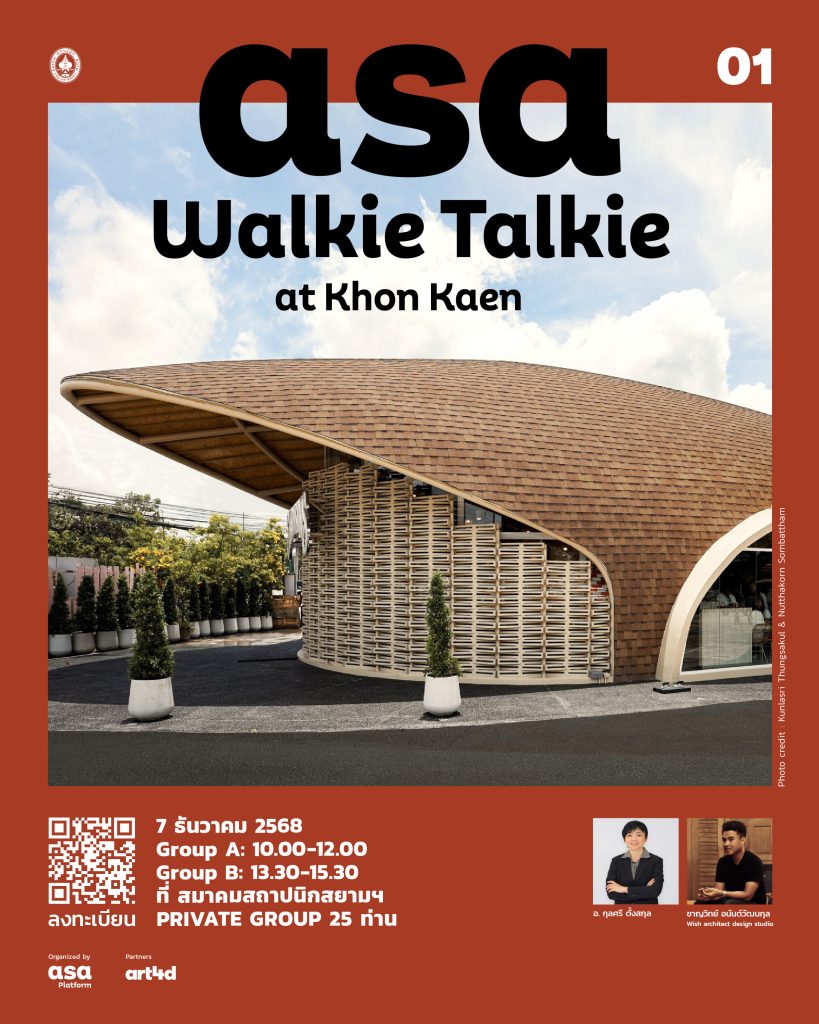 ASA Walkie Talkie ครั้งที่ 1 นี้ ASA Platform จะขอเกาะติดงานสถาปนิกอีสานที่กำลังจะจัดขึ้นในช่วงต้นเดือน ธ.ค. 2568 ไปที่ จ.ขอนแก่น ภายใต้หัวข้อถ่ายทำวีดีโอและกิจกรรมในชื่อ “Contemporary E-San” โดยจะจัดขึ้นในวันอาทิตย์ที่ 7 ธันวาคม 2568 ซึ่งจะแบ่งกิจกรรมออกเป็น 2 ช่วง เพื่อพูดคุยและสัมภาษณ์กับสถาปนิก 2 ท่าน ได้แก่ ช่วงเช้า 10.00-12.00 น. พูดคุยกับ อ.กุลศรี ตั้งสกุล ณ Swensen’s Regional Flagship Store Tontan Market และช่วงบ่าย 13.30-15.30 น. พูดคุยกับคุณชาญวิทย์ อนันต์วัฒนกุล จาก Wish Architect Design Studio ณ Vector Coffee Roaster