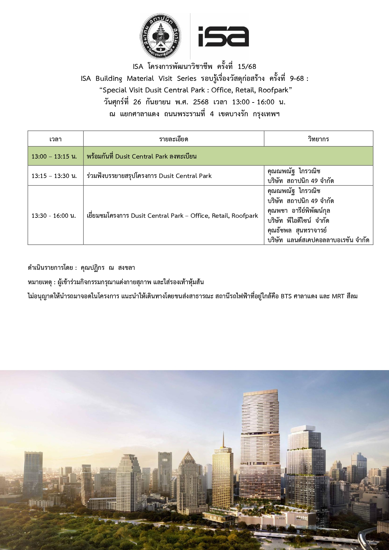 ISA โครงการพัฒนาวิชาชีพ ครั้งที่ 15/68 : Special Visit Dusit Central Park : Office, Retail, Roof Park