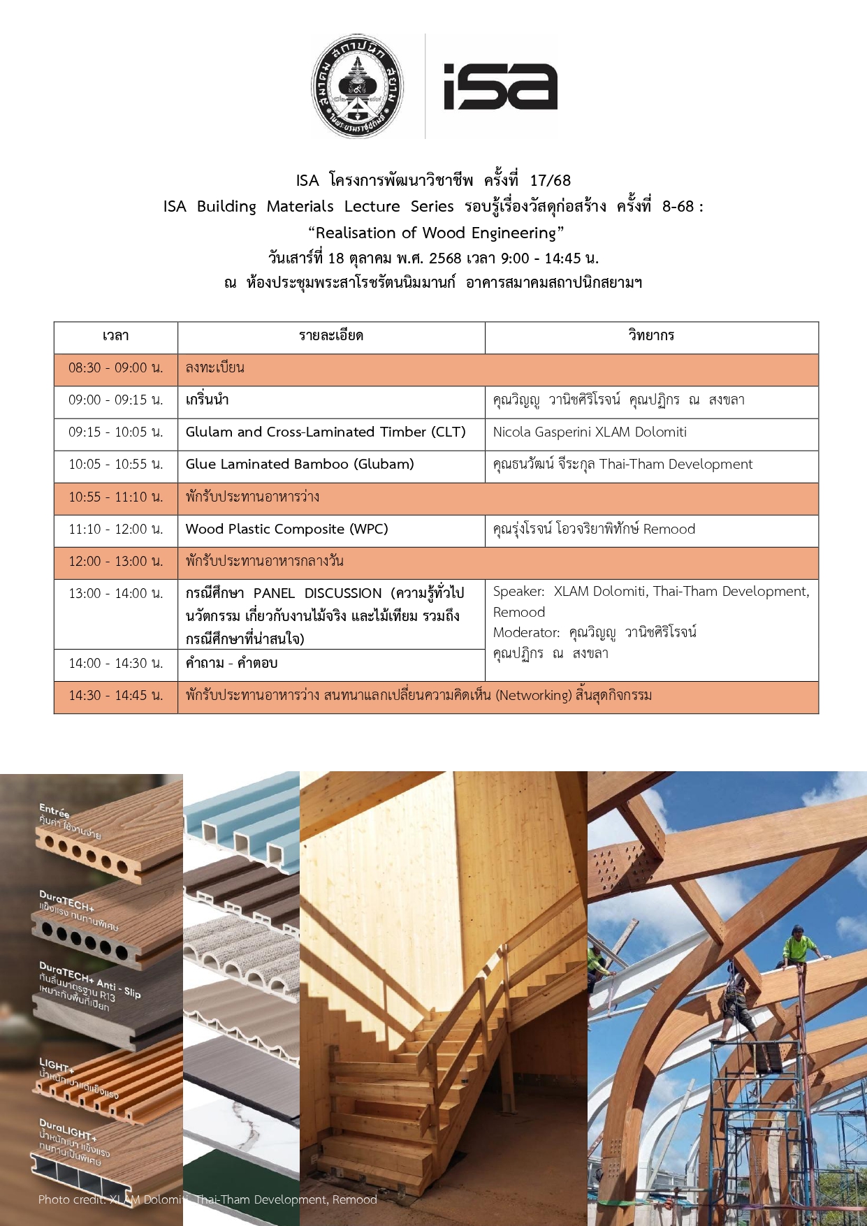 ISA โครงการพัฒนาวิชาชีพ ครั้งที่ 17/68 : Realisation of Wood Engineering