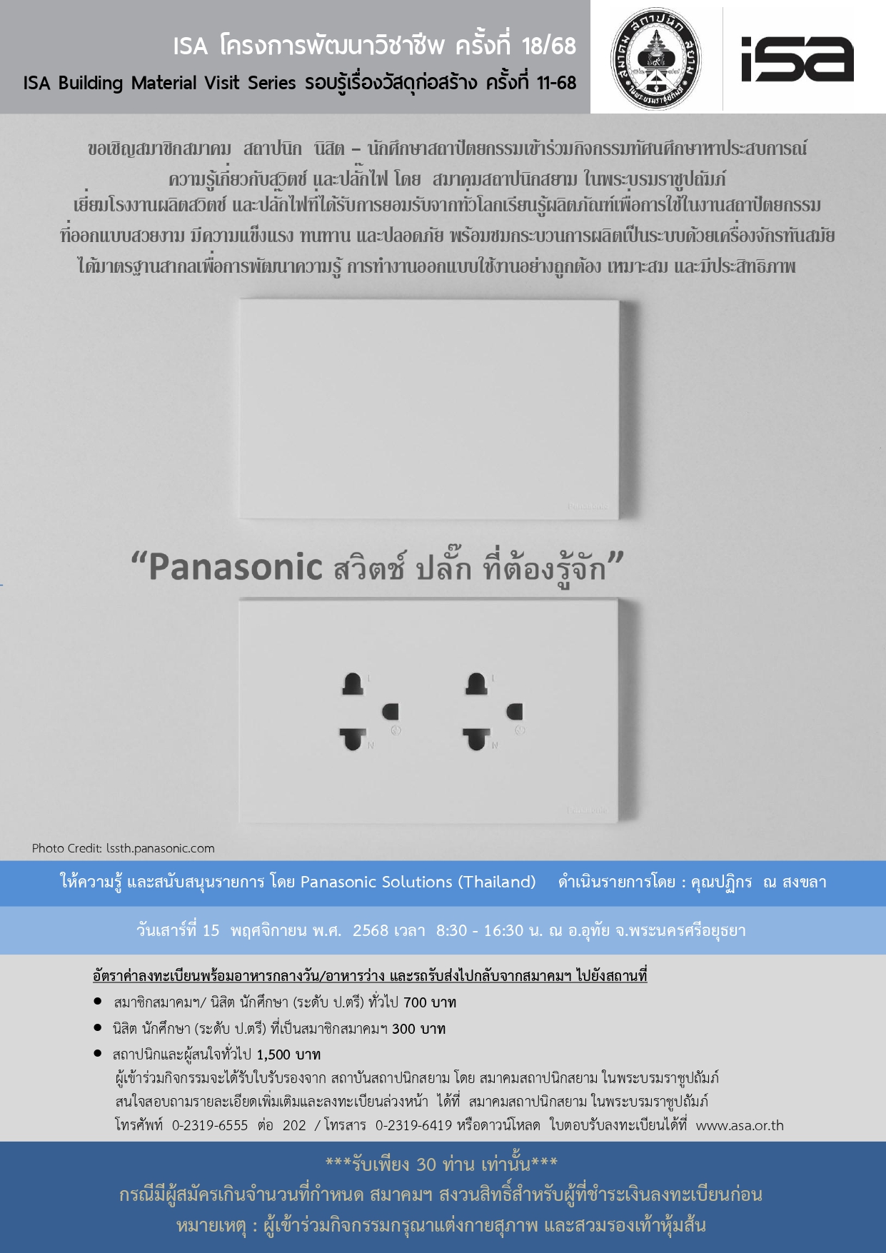 ISA โครงการพัฒนาวิชาชีพ ครั้งที่ 18/68 : Panasonic สวิตช์ ปลั๊ก ที่ต้องรู้จัก