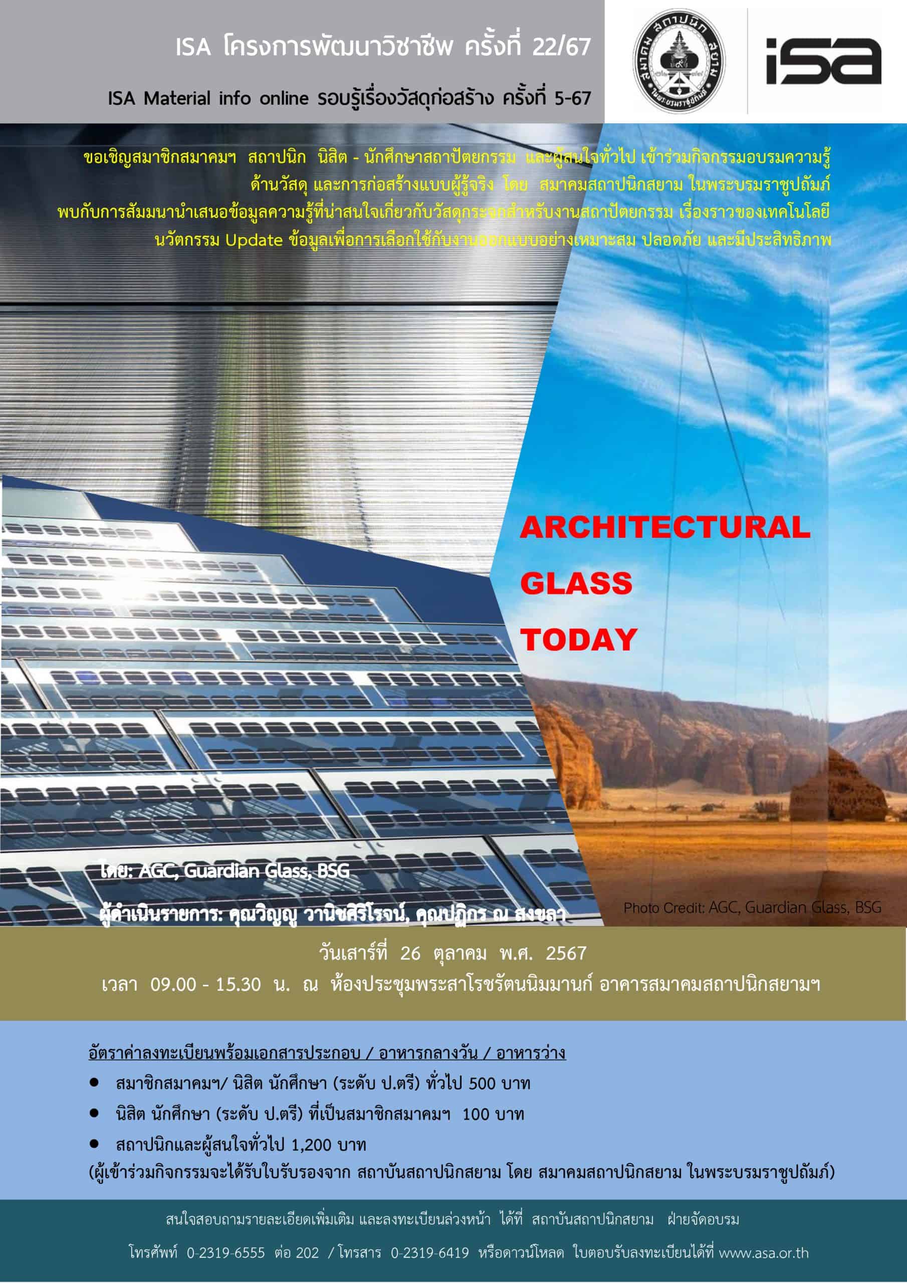 ISA โครงการพัฒนาวิชาชีพ ครั้งที่ 22/67 : ARCHITECTURAL Glass another DAY