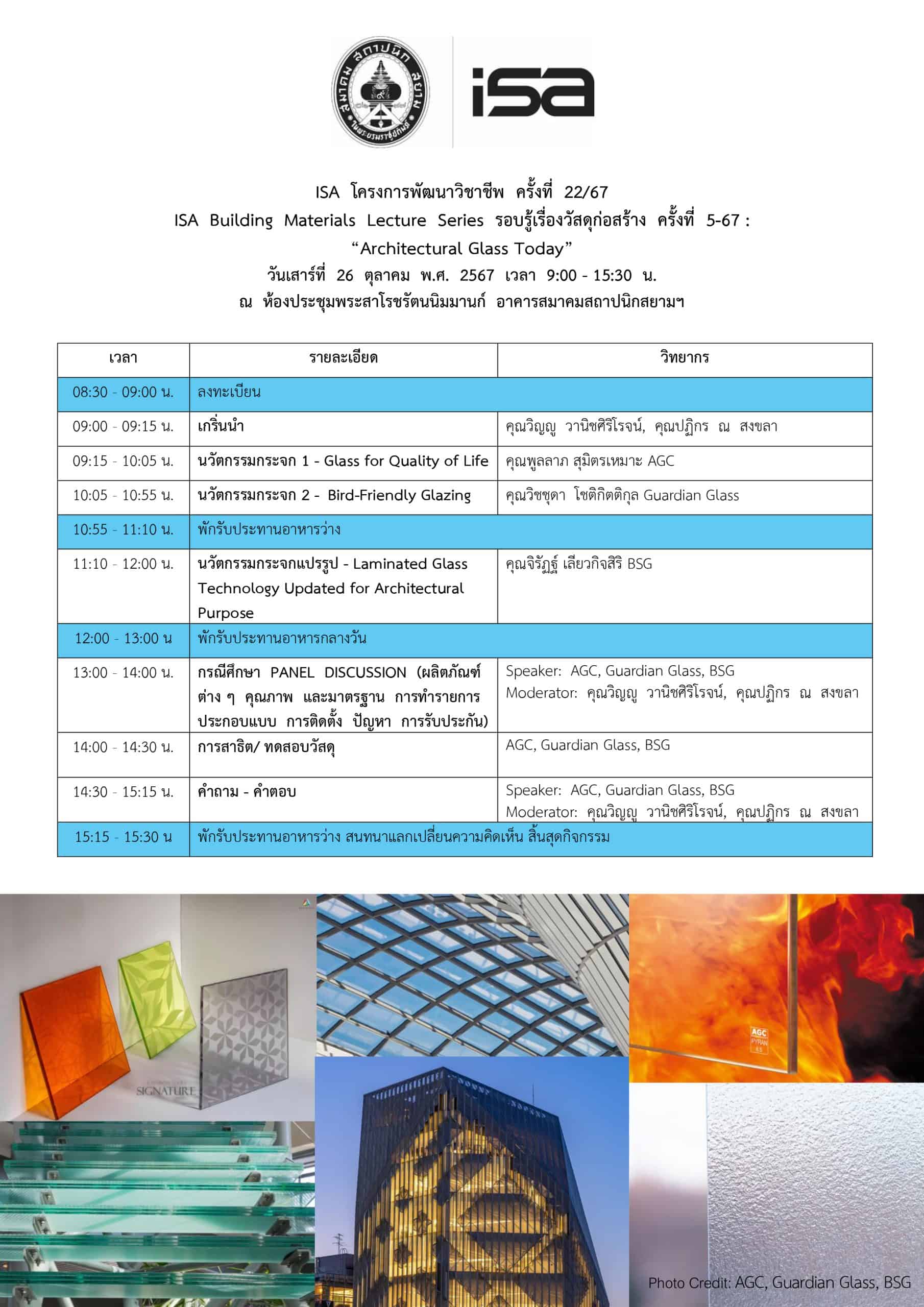 ISA โครงการพัฒนาวิชาชีพ ครั้งที่ 22/67 : ARCHITECTURAL Glass another DAY