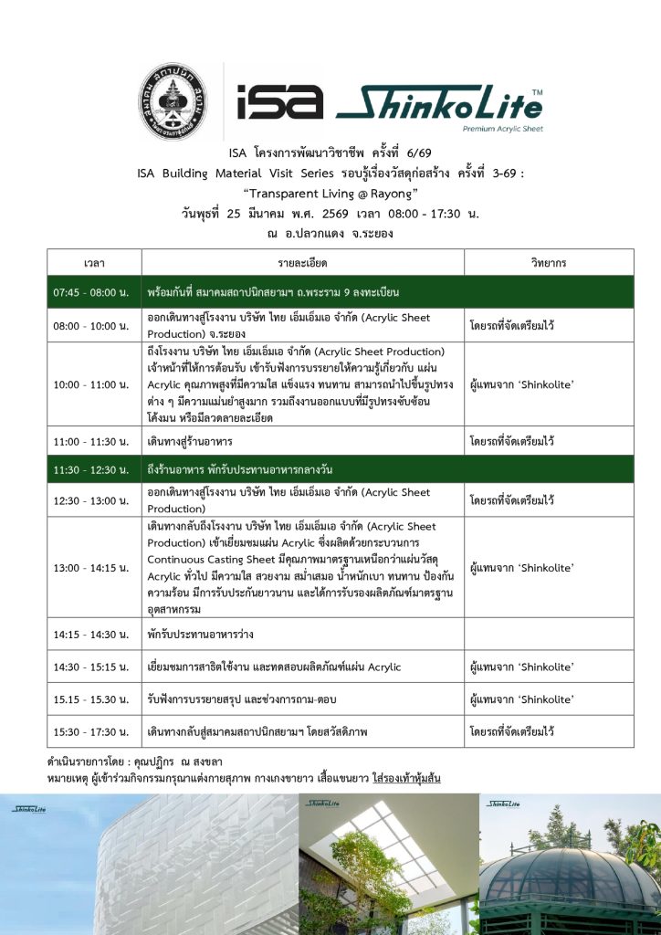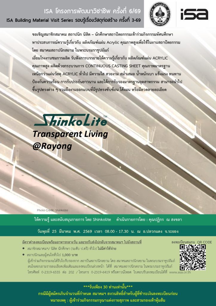 ISA โครงการพัฒนาวิชาชีพ ครั้งที่ 6/69 : Shinkolite Transparent Living @Rayong + Add to Google Calendar + iCal / Outlook export 00 days 00 hours 00 minutes 00 seconds Date Mar 25 2026 Time 08:00 - 17:30 More Info Register Register Share this event