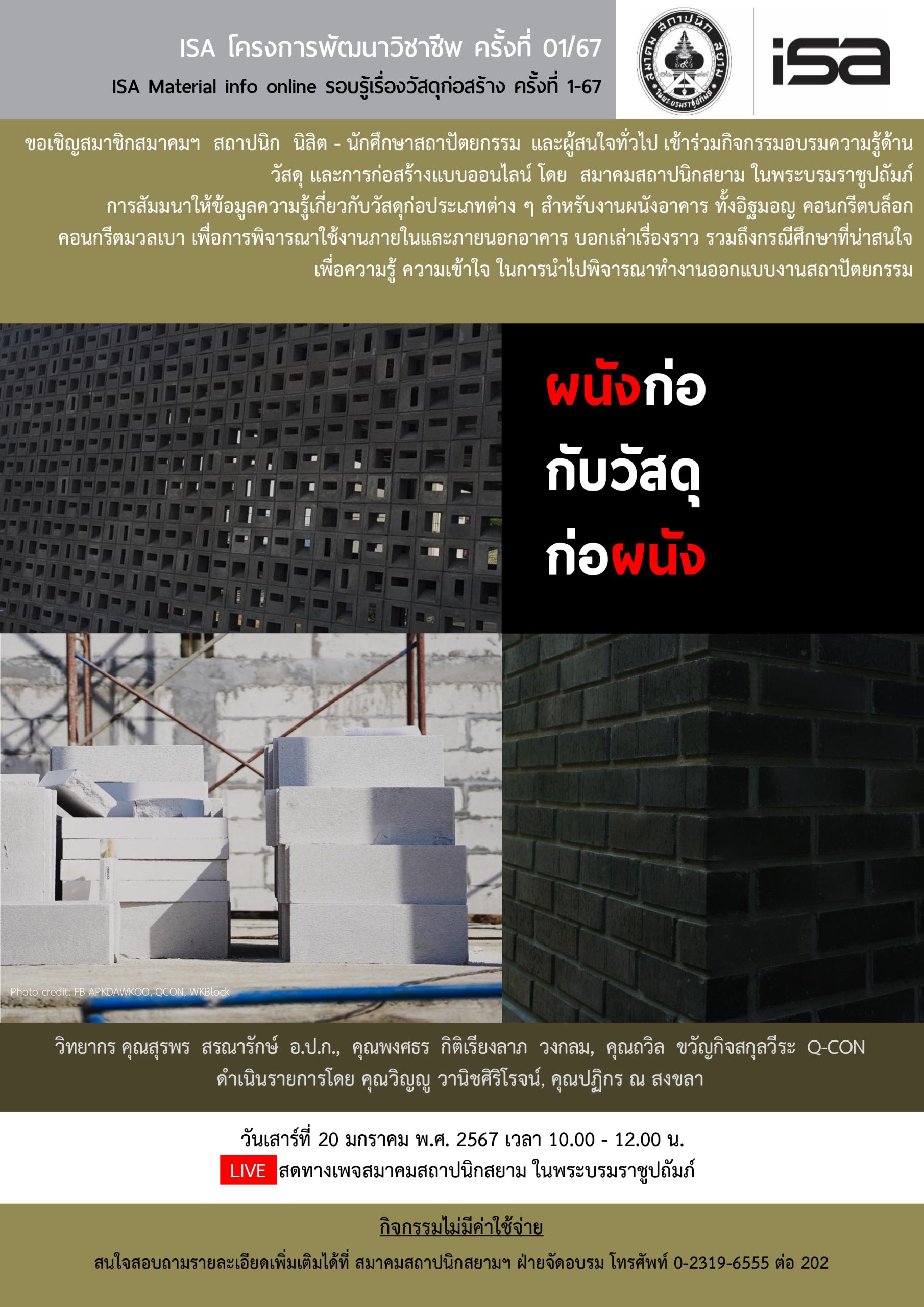 ISA โครงการพัฒนาวิชาชีพ ครั้งที่ 01/67 : ผนังก่อกับวัสดุก่อผนัง
