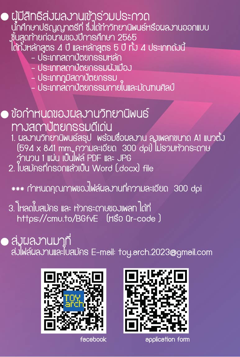 Thesis Of the Year in Architecture Award 2023 : ประกวดวิทยานิพนธ์ทางสถาปัตยกรรมดีเด่นประจำปี 2023 (TOY ARCH)