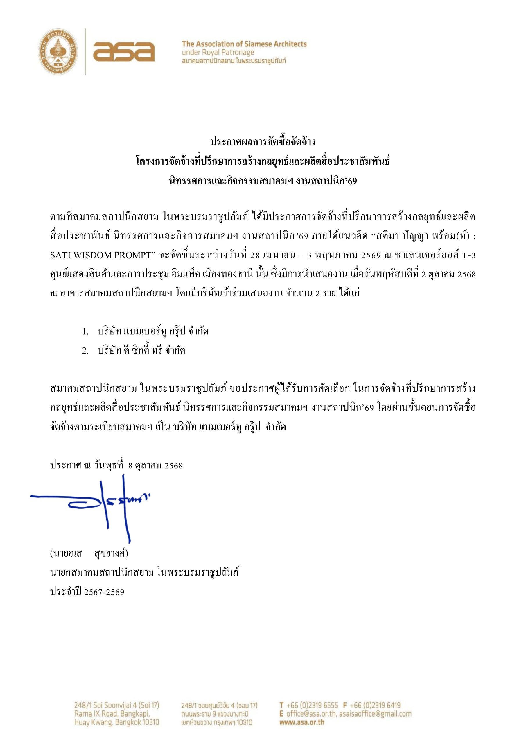 ประกาศผลการจัดจ้าง โครงการจัดจ้างที่ปรึกษาการสร้างกลยุทธ์และผลิตสื่อประชาสัมพันธ์ นิทรรศการและกิจกรรมสมาคมฯ งานสถาปนิก’69
