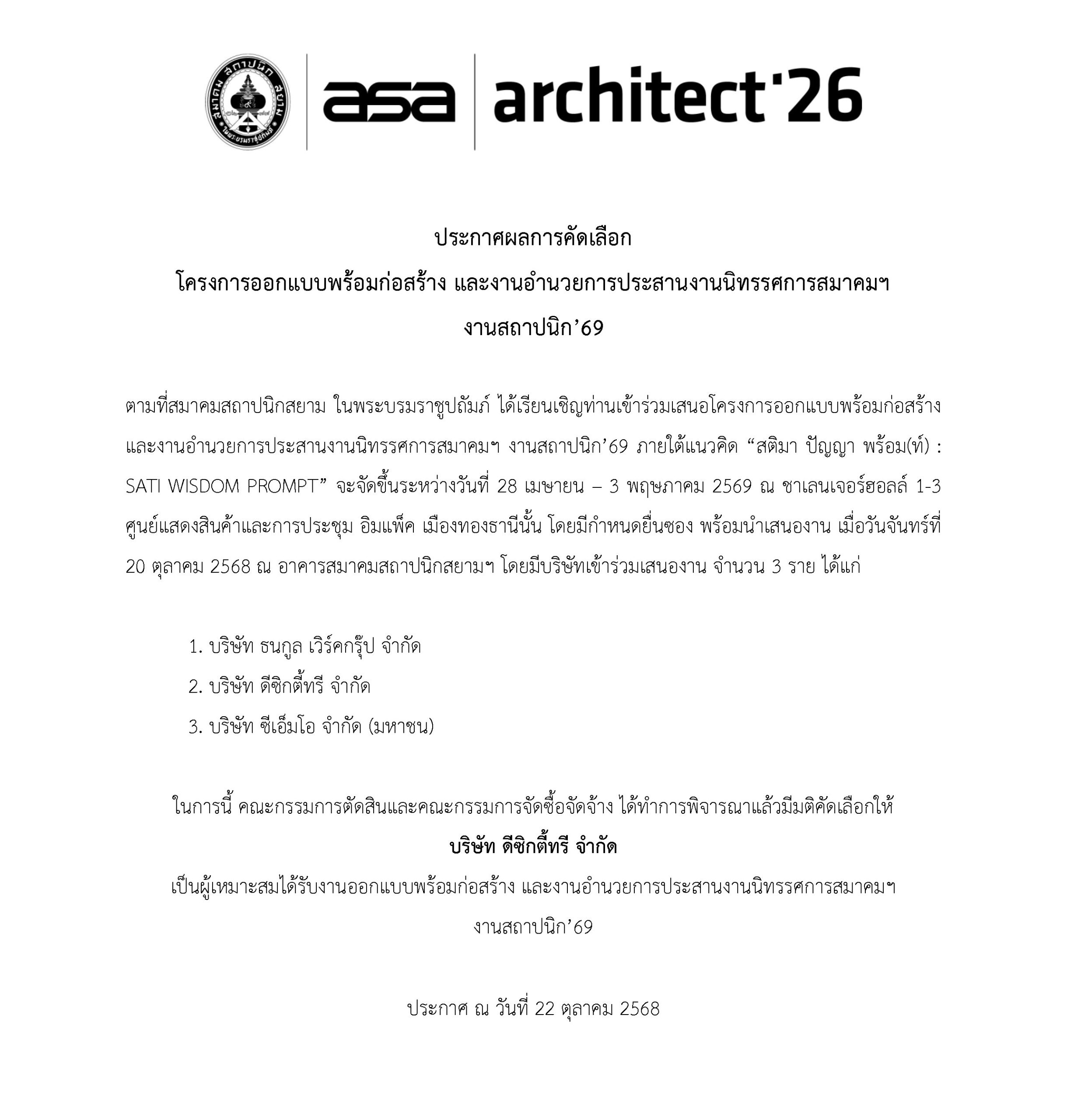 ประกาศผลการคัดเลือกโครงการออกแบบพร้อมก่อสร้าง และงานอำนวยการประสานงานนิทรรศการสมาคมฯ งานสถาปนิก’69