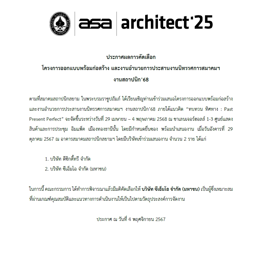 ประกาศผลการคัดเลือก โครงการออกแบบพร้อมก่อสร้าง และงานอำนวยการประสานงานนิทรรศการสมาคมฯ งานสถาปนิก’68