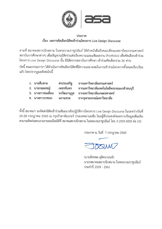 ประกาศผลการคัดเลือกนิสิตเข้าร่วมโครงการ Live Design Discourse