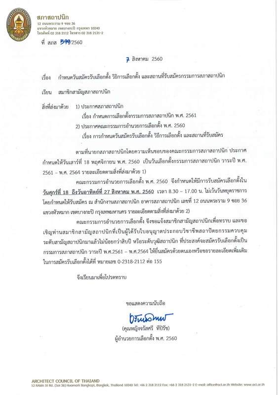 ประกาศสภาสถาปนิก เรื่อง กำหนดวันสมัครรับเลือกตั้ง วิธีการเลือกตั้ง และสถานที่รับสมัครกรรมการสภาสถาปนิก