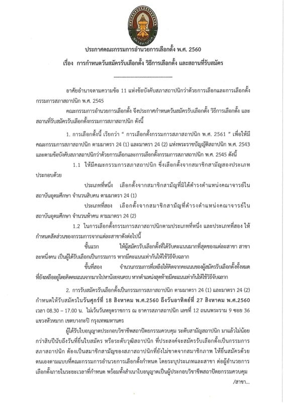 ประกาศสภาสถาปนิก เรื่อง กำหนดวันสมัครรับเลือกตั้ง วิธีการเลือกตั้ง และสถานที่รับสมัครกรรมการสภาสถาปนิก