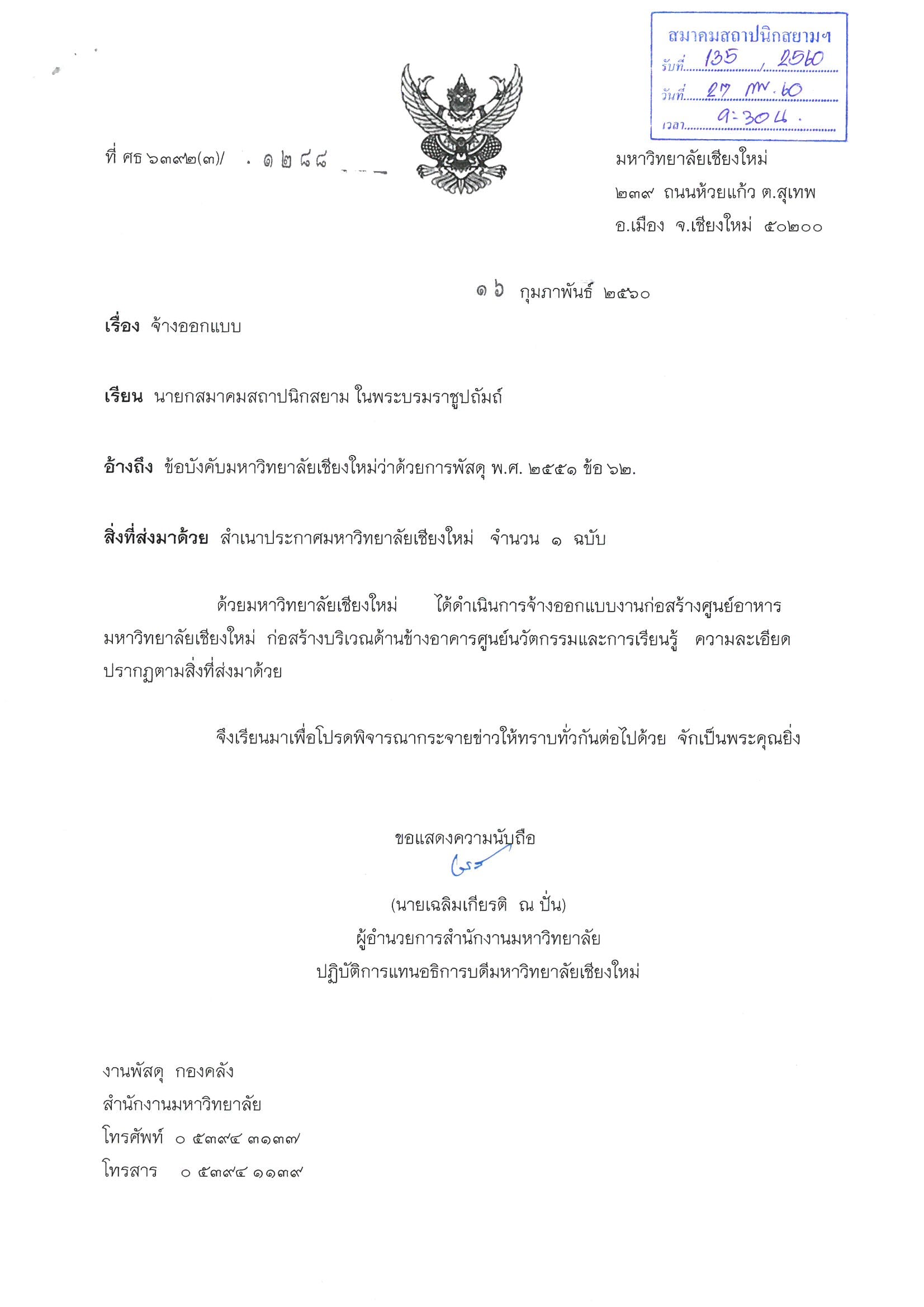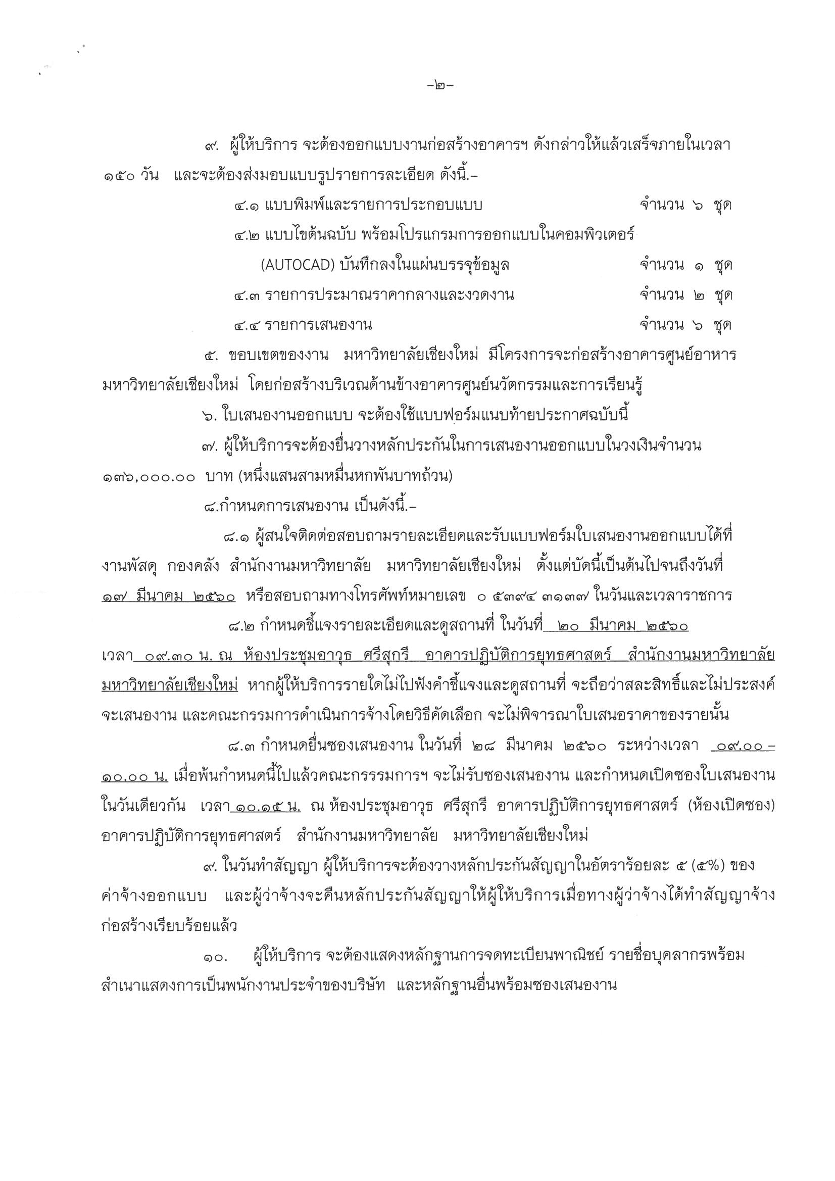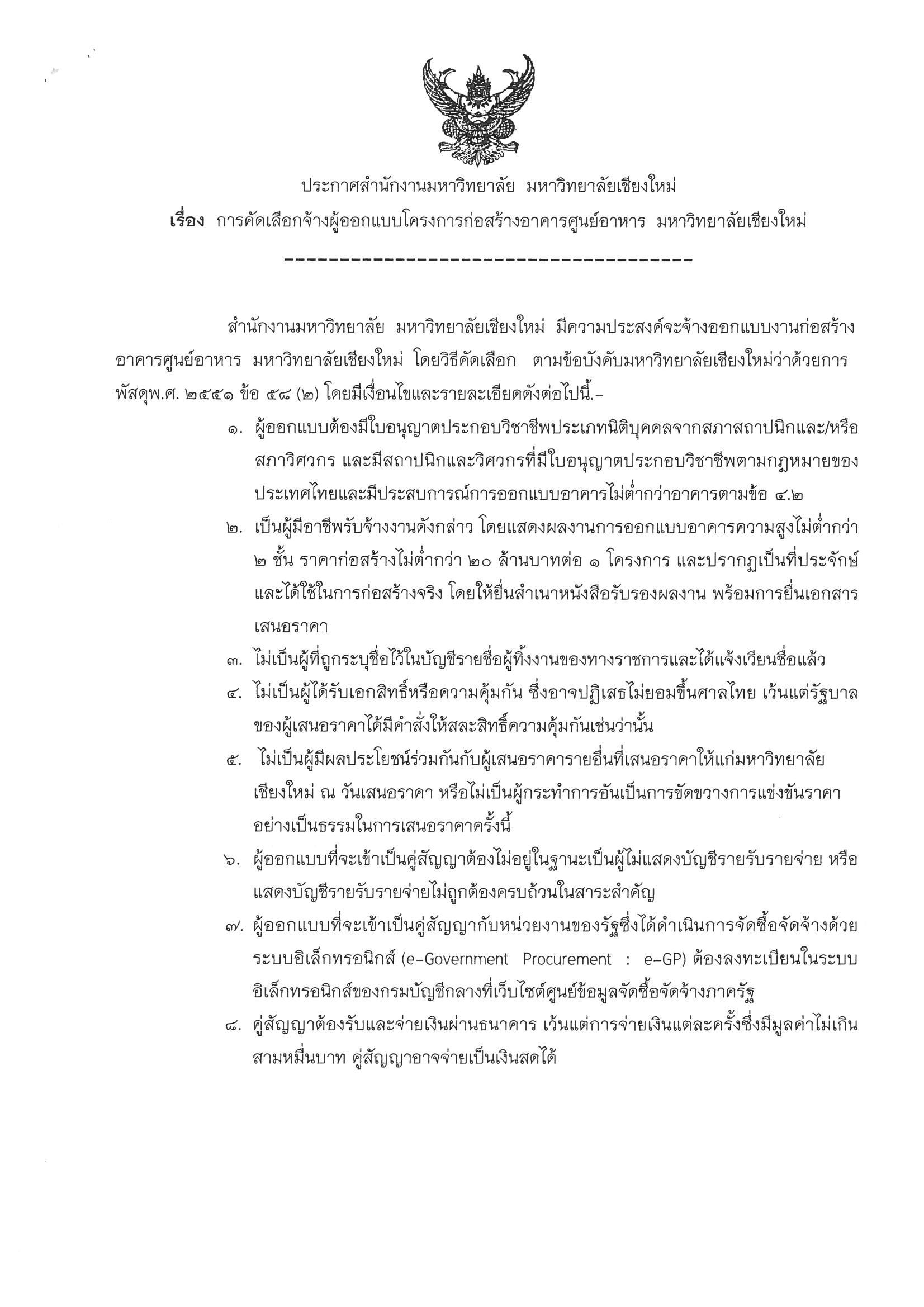 Home » News » ประกาศสำนักงานมหาวิทยาลัย มหาวิทยาลัยเชียงใหม่ เรื่อง การคัดเลือกจ้างผู้ออกแบบโครงการก่อสร้างอาคารศูนย์อาหาร มหาวิทยาลัยเชียงใหม่