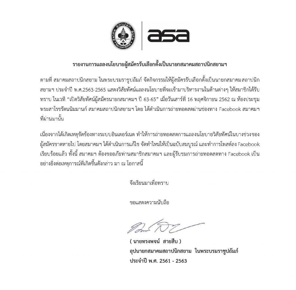 รายงานการแถลงนโยบายผู้สมัครรับเลือกตั้งนายกสมาคมสถาปนิกสยาม ในพระบรมราชูปถัมภ์