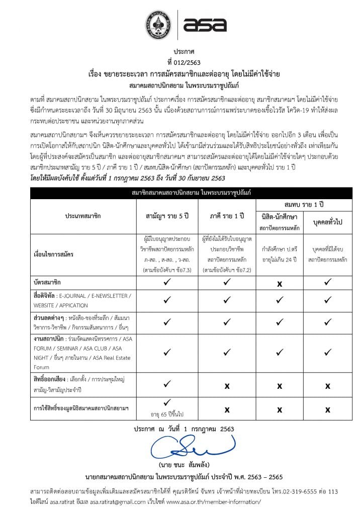 ประกาศ ขยายระยะเวลา การสมัครสมาชิกและต่ออายุ โดยไม่มีค่าใช้จ่าย สมาคมสถาปนิกสยาม ในพระบรมราชูปถัมภ์