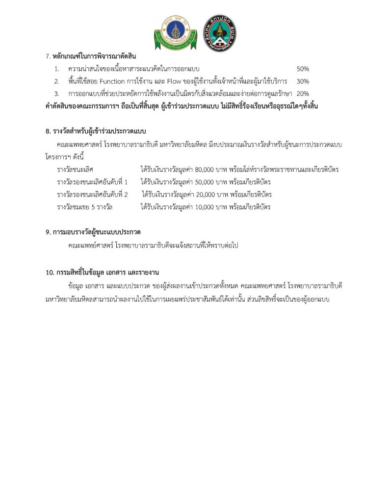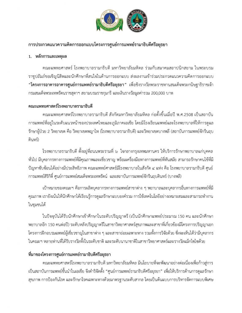 คณะแพทย์ศาสตร์ โรงพยาบาลรามาธิบดี มหาวิทยาลัยมหิดล ร่วมกับ สมาคมสถาปนิกสยาม ในพระบรมราชูปถัมภ์ จัดโครงการประกวดแนวความคิดการออกแบบศูนย์แพทย์รามาธิบดีศรีอยุธยา เพื่อเปิดโอกาสให้นิสิต นักศึกษา ได้ใช้ความคิดสร้างสรรค์ในการออกแบบโรงพยาบาลให้เป็นสถานที่ให้บริการด้านการดูแลและรักษาสุขภาพการป้องกันโรคด้วยมาตรฐานระดับสากลโดยผู้ชนะเลิศจะได้รับรางวัลพระราชทานจากสมเด็จพระกนิษฐาธิราชเจ้า กรมสมเด็จพระเทพรัตนราชสุดาฯ สยามบรมราชกุมารี