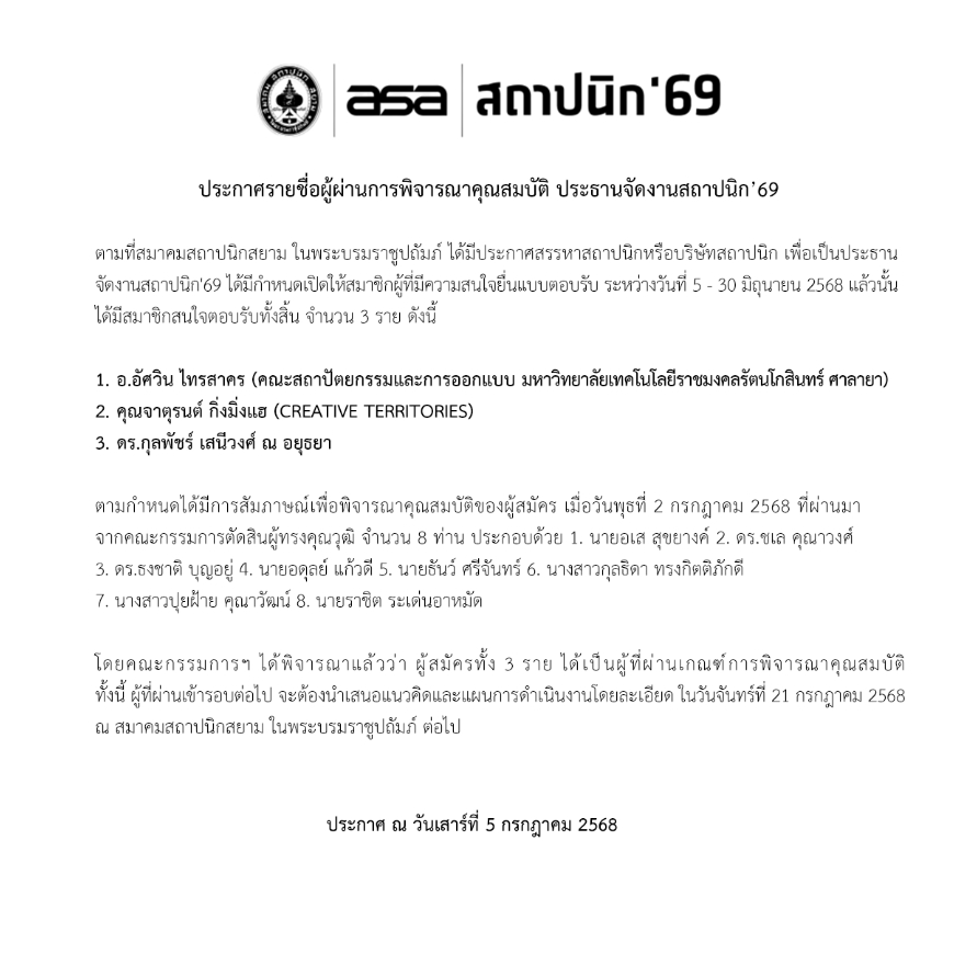 ประกาศรายชื่อผู้ผ่านการพิจารณาคุณสมบัติ ประธานจัดงานสถาปนิก’69